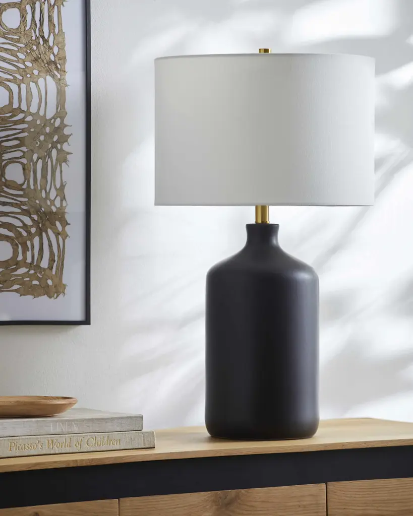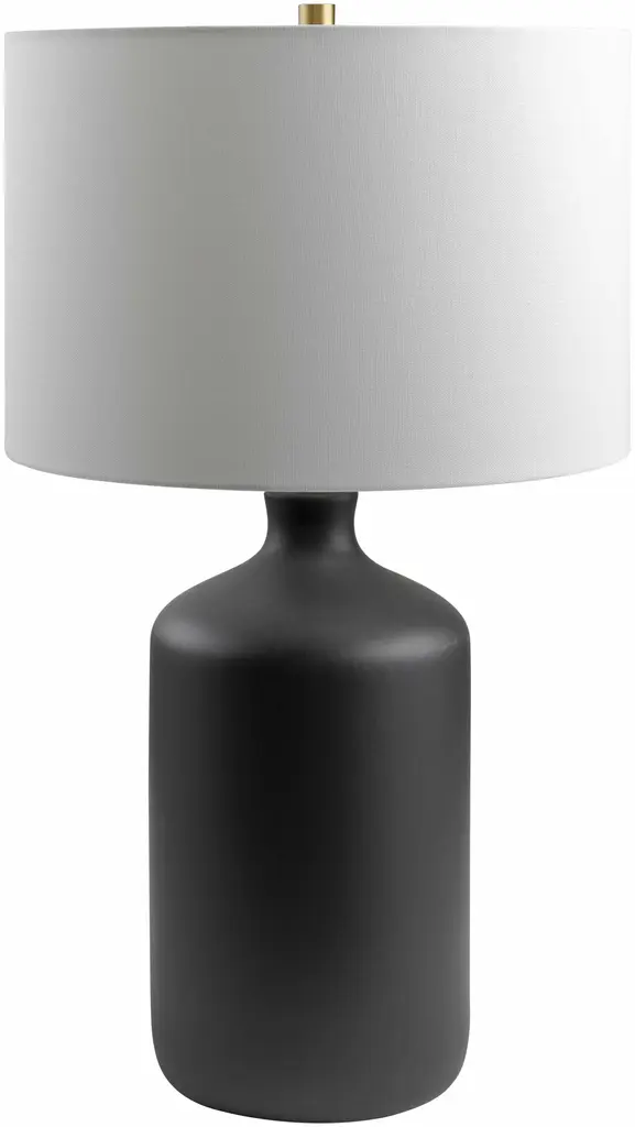 Collection: Cossignano Colors: White, Black Material: Body: Ceramic,Shade (Outside): Linen,Finial: Iron Styles: Transitional,Traditional Made In: China Shade Material: Linen Shade Color: WhiteWhite Cord Length: 6' Switch Type: On/Off Number of Bulbs: 1 Socket Type: E-26 Bulb Wattage: 100W
