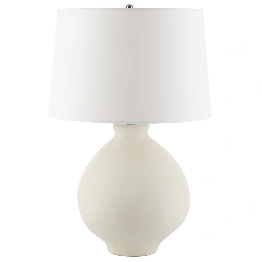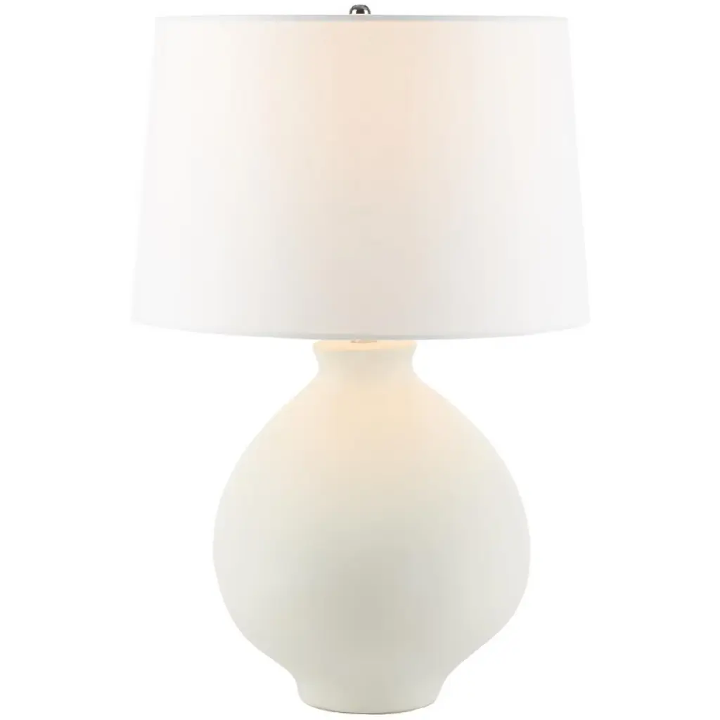 Introducing the Costa ceramic table lamp, a blend of elegance and simplicity that enhances any room. Standing at 25.5 inches, this lamp features a timeless white ceramic and iron base, offering a fresh and clean look. The cotton and linen shade softly diffuses light, creating a warm and inviting atmosphere perfect for a living space or bedroom. The Costa lamp embodies a design that seamlessly fits into various decor styles, bringing both functionality and aesthetic appeal. Its sturdy construction ensures that it remains a focal point in your home. Whether placed on a bedside table or a side table in the living room, this lamp effortlessly elevates the ambiance. Add a touch of charm to your interiors with the Costa ceramic table lamp. Experience an interior transformation with this exquisite addition to your lighting collection. Light up your evenings with style and simplicity.