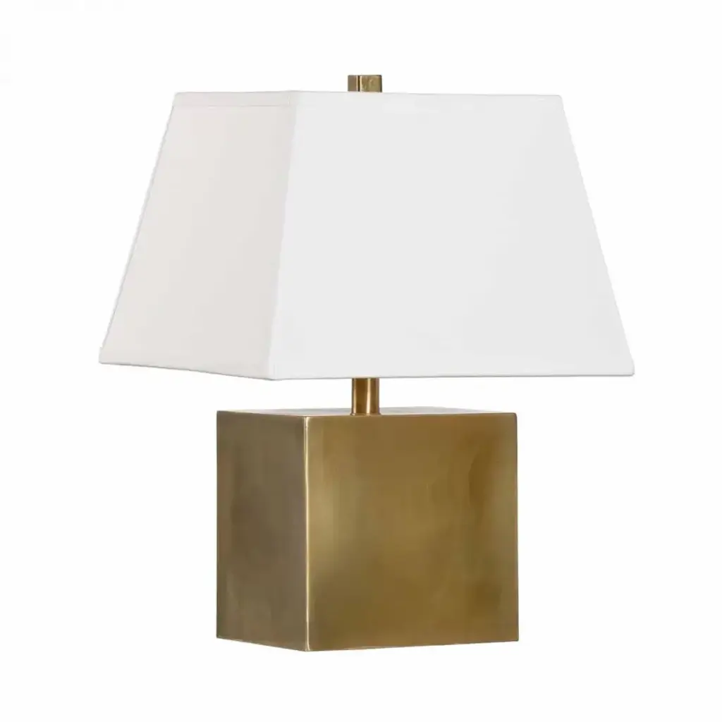 The rich metallic finish underscores this table lamp's sculptural elegance, while the rounded linen shade complements the lamp's sharp angles.