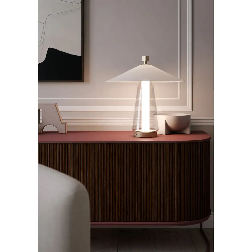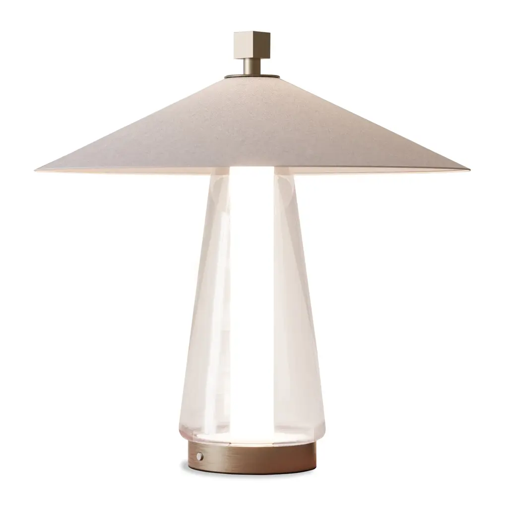 Experience the perfect harmony of function and art with our Cotton Shade Table Lamp from Contardi Asia. Inspired by Chinese rice pickers' hats, the lampshade combines fabric, glass, and metal for a unique and elegant design. Embrace the fusion of technology and creativity with this clean and sophisticated addition to any space.