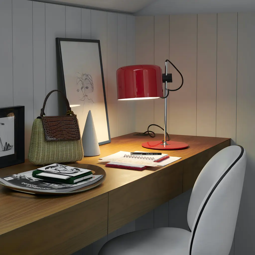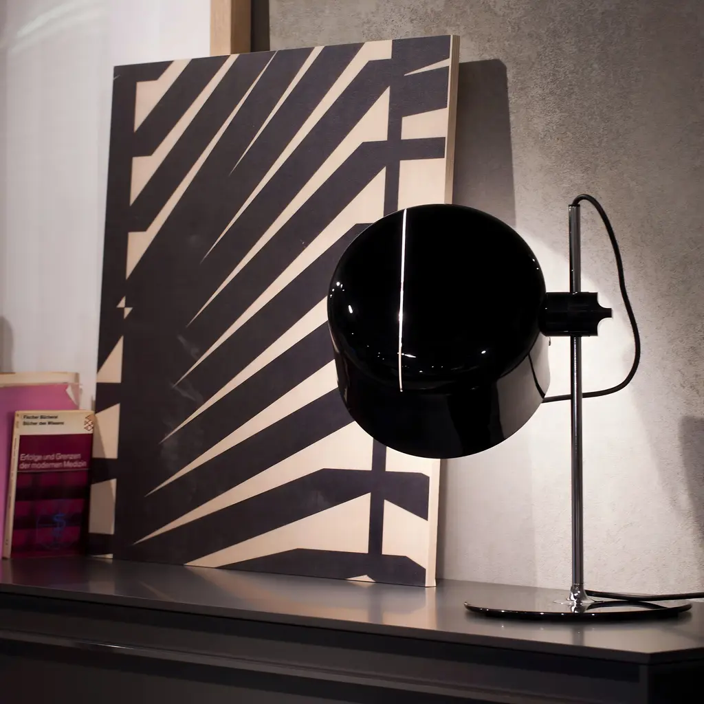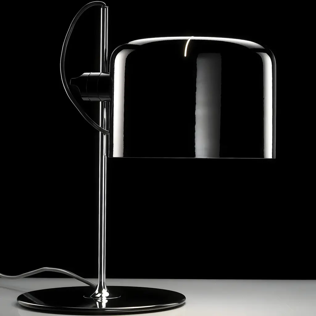 A covetable table lamp with a storied heritage, this variation from Joe Columbo's 1967 Coupé series remains as striking as it is useful. A simple, ingenious mechanism connects the chromed stem to the gloss lacquered aluminum shade (matching the metal base) and the light beam can be aimed in any direction by simply moving the dome up, down as well as tilting it sideways. Oluce's enduring design is also part of the permanent collection at MoMA in New York and Munich's Neue Sammlung Museum.