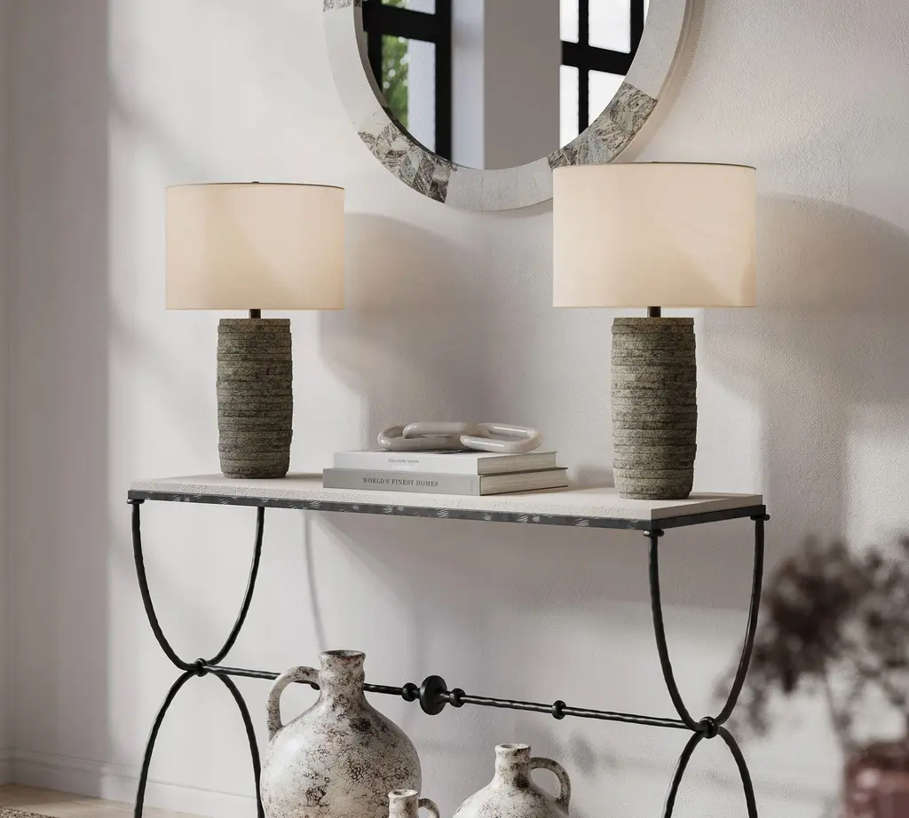 Discs of terra cotta on a wrought-iron frame give the Courtland Table Lamp its rustic appeal. The natural materials exhibit subtle variations in color and texture, making each piece slightly different.