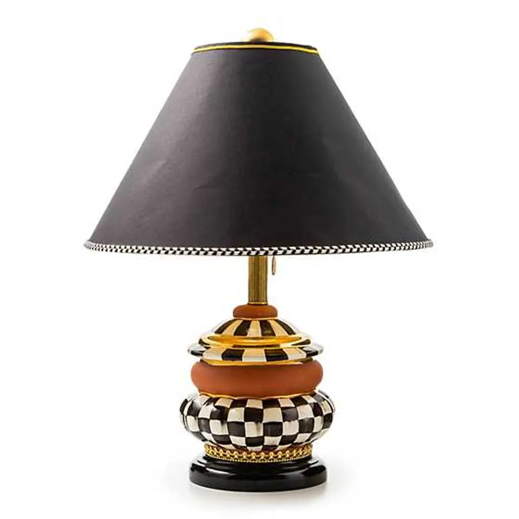 The Courtly Check® Groovy Table Lamp features our Aurora-made, hand-painted ceramic Groovy Canister, mixing hand-painted checks and stripes with terra cotta on a black beech base. It’s topped with a black silk dupioni shade, finished with braided black and white trim, and crowned with a gold lustre finial.
