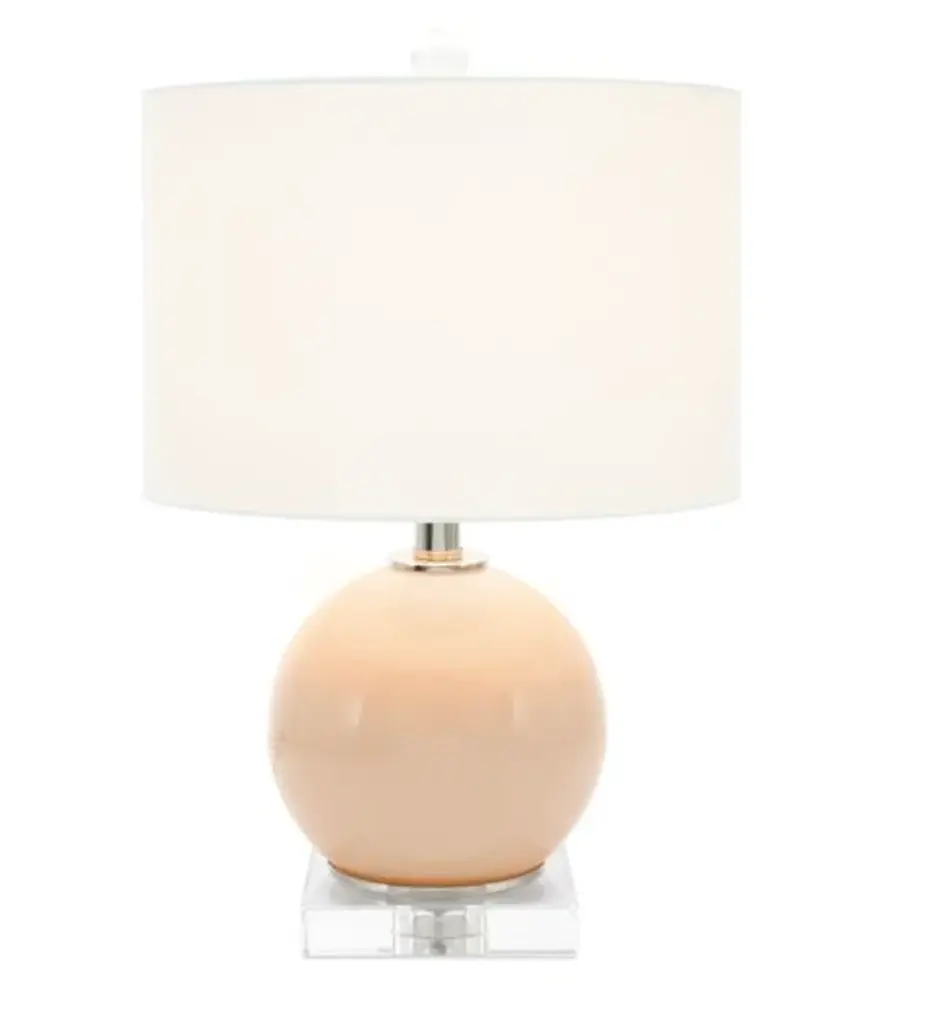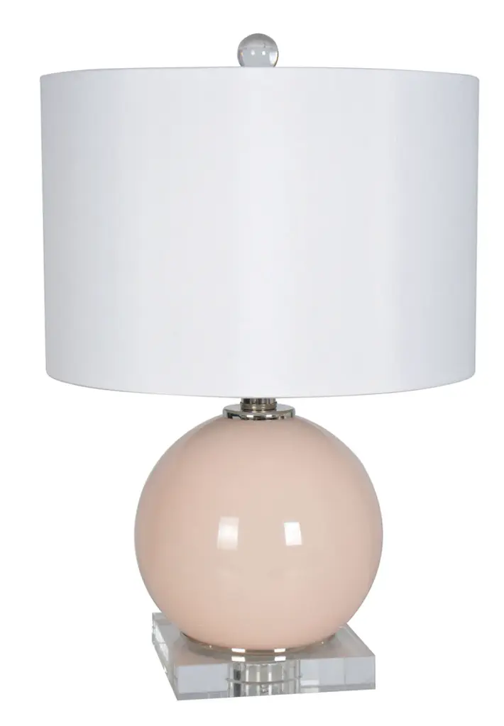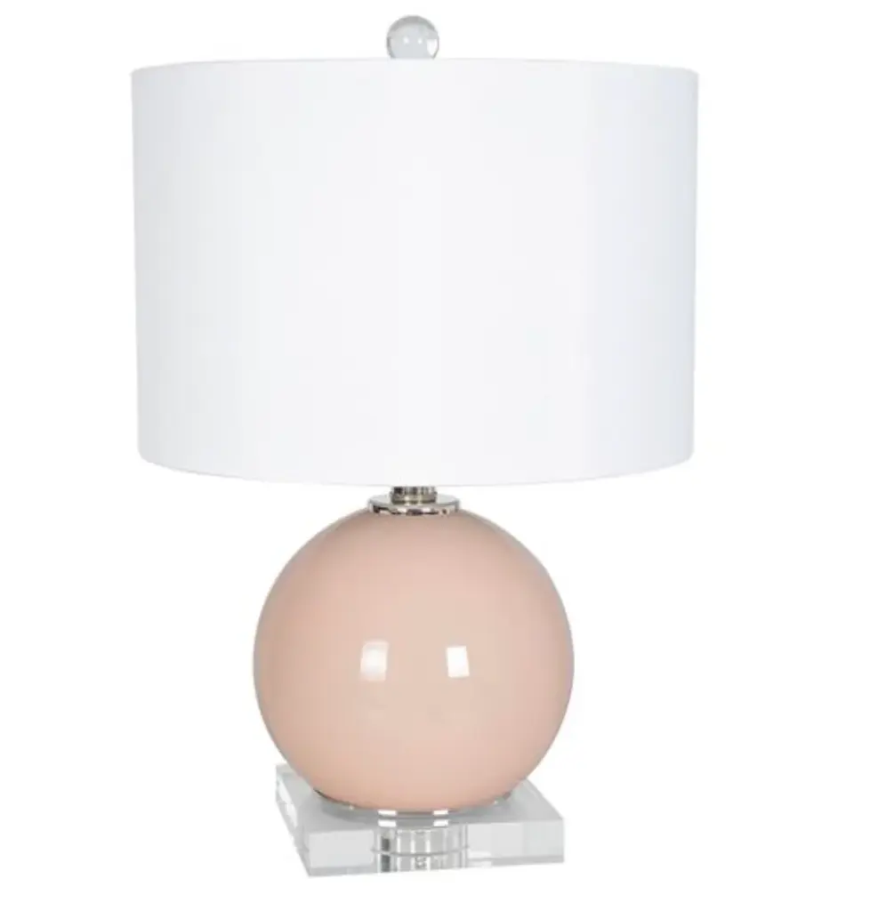 Reverse-painted glass orb, on square optic crystal base. Accented with polished steel accents. Topped with a white faux silk drum shade, and crystal ball finial. Small-scale to work in a variety of spaces - a perfect size to complement any feminine interiors. Available in lilac, white, blue or pink Height: 18.5" Width: 12" Length: 12" Uses one maximum 100 watt bulb (not included). 3-way switch Wipe gently with a soft, dry cloth or a feather duster. Ships within 2-3 business days Complimentary shipping in the U.S.