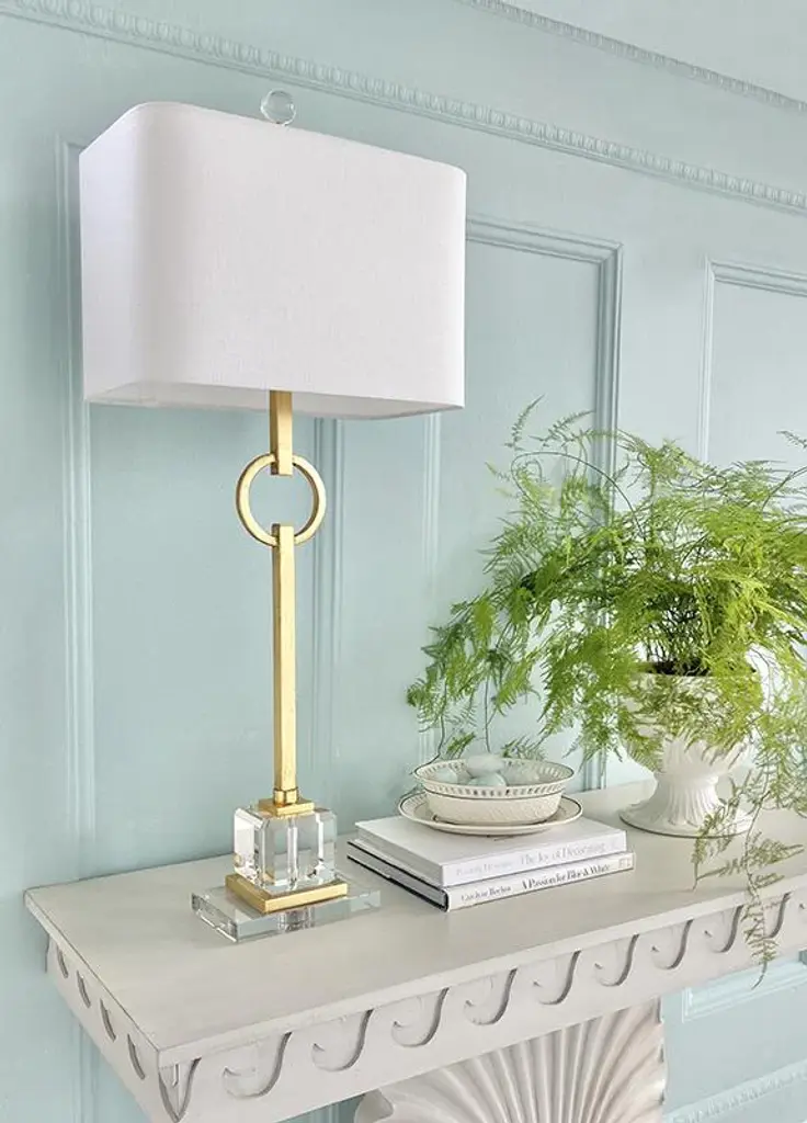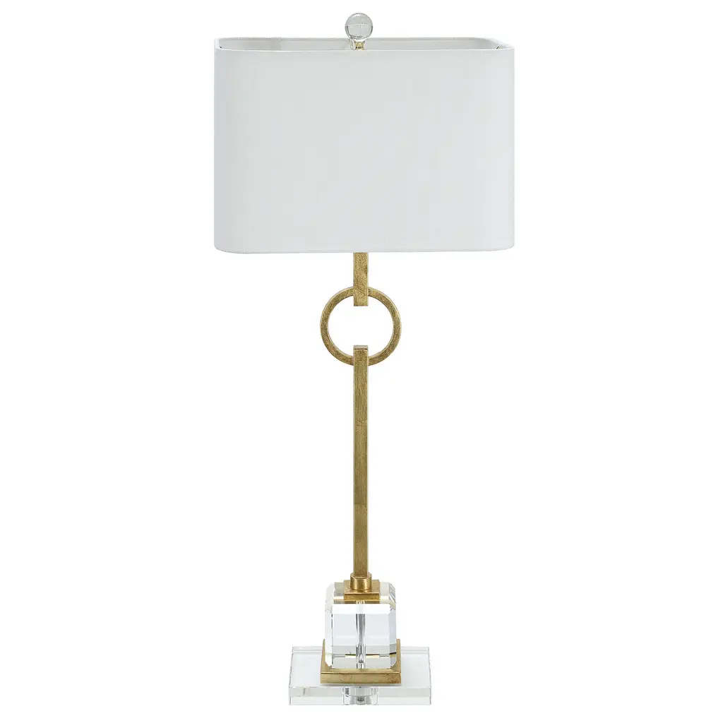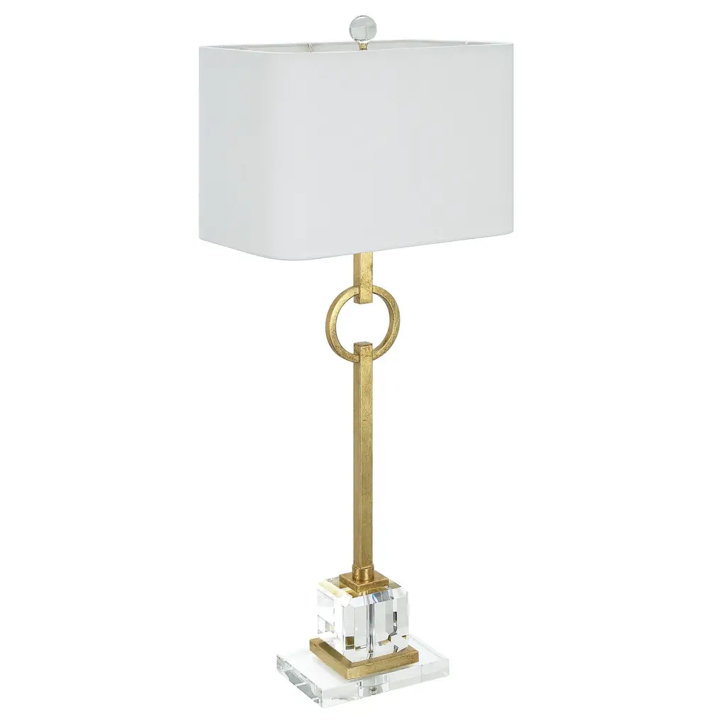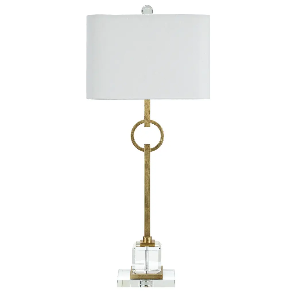 Blending a sleek, contemporary style with traditional finish and materials to make the perfect transitional buffet. The gold leaf buffet has a handsome open ring accent just below the neck with stacked crystal base. The Elaina lamp has a sophisticated and contemporary style so that it can stand alone - or it will be even better as a pair in your living room, dining room, home office or on your bedside table. Gold Leaf Buffet Table Lamp White slub linen rectangle hardback shade with white lining Uses one maximum 100 watt 3-way bulb (not included). On-off neck switch. Free shipping in the U.S. Finish Name/Color Gold Leaf with Light Antique Washed Metal + Optic Crystal Product Weight - lbs 10.96 Width/Diameter ALL INCHES 7.5" Height base to shade btm 25" Depth 5.125" overall height 36.5" Voltage 120 Cord Length 72" Cord Color Clear Silver Wattage 100w Bulb Type 3-way Number of Bulbs 1 Bulb included? NO Dimmable? NO Dupioni Silk, Paper, Metal, Etc. 10/16 x 10/16 x 10.5"H Rectangle Hardback in White Slub Linen / White Lining Shade Length 10 Shade Height 10.5 Shade Depth 16 Shade Material Slub Linen Shade Color White Shipping Lead Time for In-stock Goods 3 business days