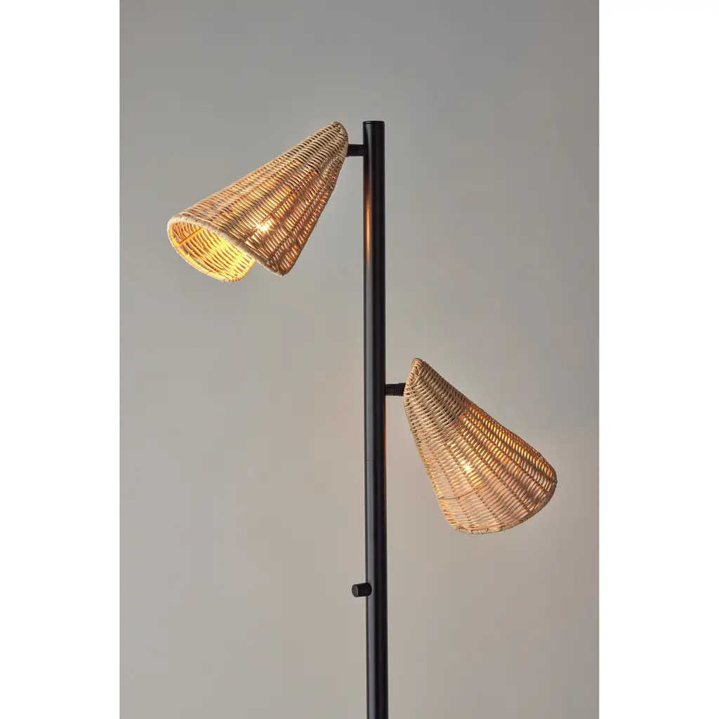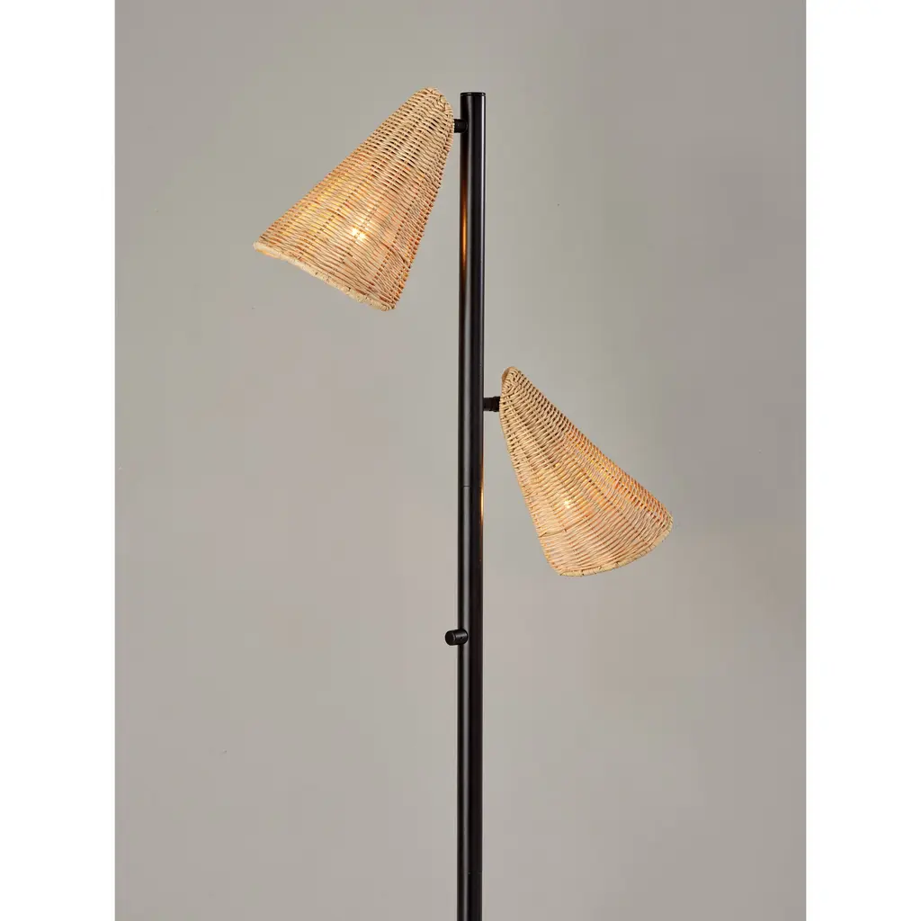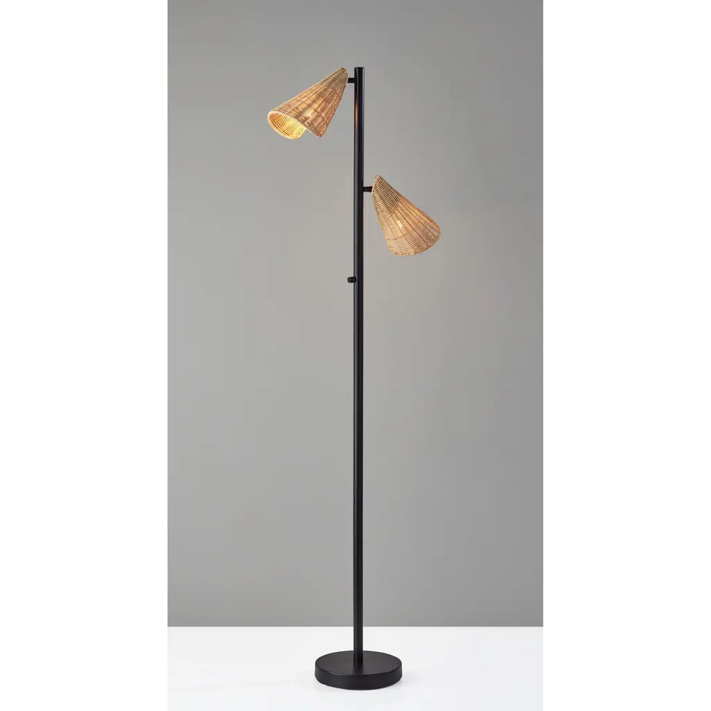 Featuring a blend of natural and contemporary elements and style lines, the Cove tree lamp adds a distinctive look to any room. With a height of 62.75" and width of only 13", the compact footprint makes for a perfect lighting choice behind or beside furniture or in room corners and suits the needs of smaller spaces. The round black metal base and matching thin stem in clean lines complement contemporary or modern chic décor. The stem features two lights at staggered heights and directions, each with a hood-shaped shade fashioned of natural rattan material for a unique look. The base of both shades includes an articulation point, allowing you to rotate the shades up or down and side to side to direct the light wherever it's needed. A rotary switch located on the stem allows you to easily turn the two 60W bulbs on or off, while the lamp is powered by a 5' black cord. For mid-century modern appeal, the Cove tree lamp is also available with an antique brass finish. Complete your space's décor with the coordinating Cove desk lamp and floor lamp. Features: Compact design is perfectly suited to smaller spaces. Black metal construction complements modern or contemporary décor. The base of both lampshades features an articulation point to direct the light wherever it's needed. Also available with an antique brass finish that appeals to mid-century modern style. Complete your décor with the coordinating Cove desk lamp and floor lamp. Lamp Measures 62.75"H. x 19.25" Max.W. x 13" Max.D. Shade measures 5.5"W X 9.25"L Natural Rattan Shade 60W E26 Bulbs Required (Not included) Rotary Switch on Tube Base measures Round 9" Dia. x 1.5"H 60" Black cord