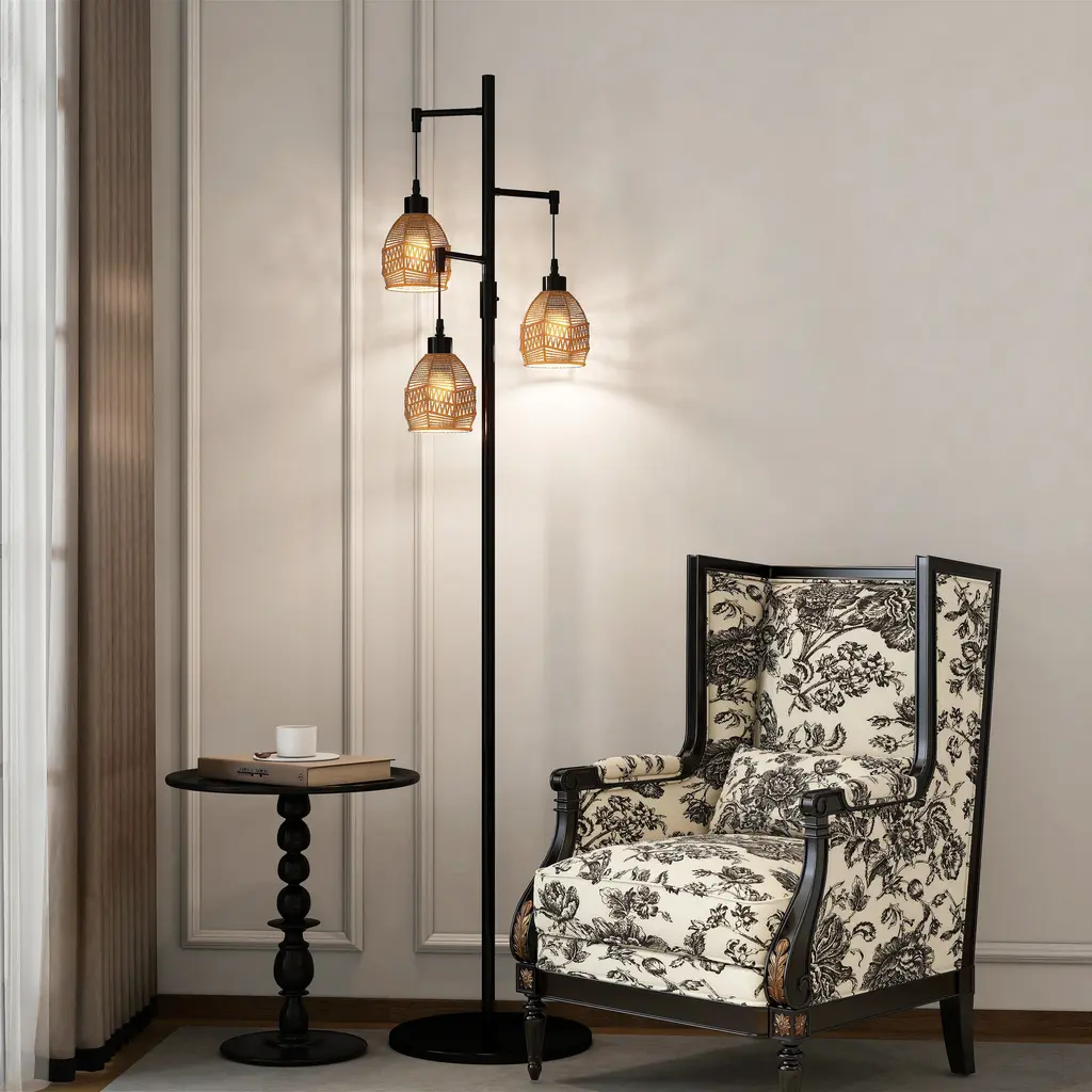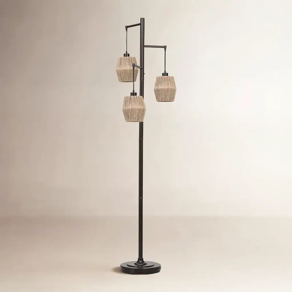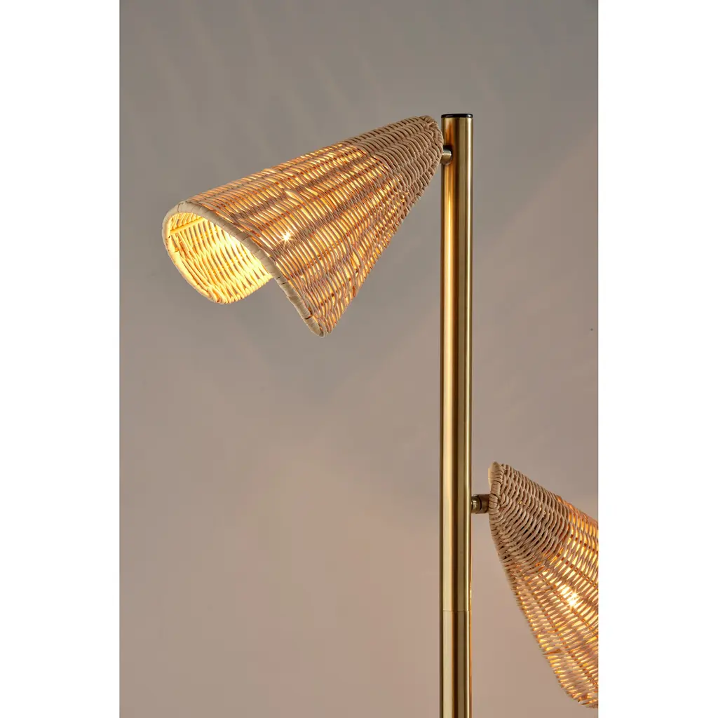 Featuring a blend of natural and contemporary elements and style lines, the Cove tree lamp adds a distinctive look to any room. With a height of 62.75" and width of only 13", the compact footprint makes for a perfect lighting choice behind or beside furniture or in room corners and suits the needs of smaller spaces. The round black metal base and matching thin stem in clean lines complement contemporary or modern chic décor. The stem features two lights at staggered heights and directions, each with a hood-shaped shade fashioned of natural rattan material for a unique look. The base of both shades includes an articulation point, allowing you to rotate the shades up or down and side to side to direct the light wherever it's needed. A rotary switch located on the stem allows you to easily turn the two 60W bulbs on or off, while the lamp is powered by a 5' black cord. For mid-century modern appeal, the Cove tree lamp is also available with an antique brass finish. Complete your space's décor with the coordinating Cove desk lamp and floor lamp. Features: Compact design is perfectly suited to smaller spaces. Black metal construction complements modern or contemporary décor. The base of both lampshades features an articulation point to direct the light wherever it's needed. Also available with an antique brass finish that appeals to mid-century modern style. Complete your décor with the coordinating Cove desk lamp and floor lamp. Lamp Measures 62.75"H. x 19.25" Max.W. x 13" Max.D. Shade measures 5.5"W X 9.25"L Natural Rattan Shade 60W E26 Bulbs Required (Not included) Rotary Switch on Tube Base measures Round 9" Dia. x 1.5"H 60" Black cord