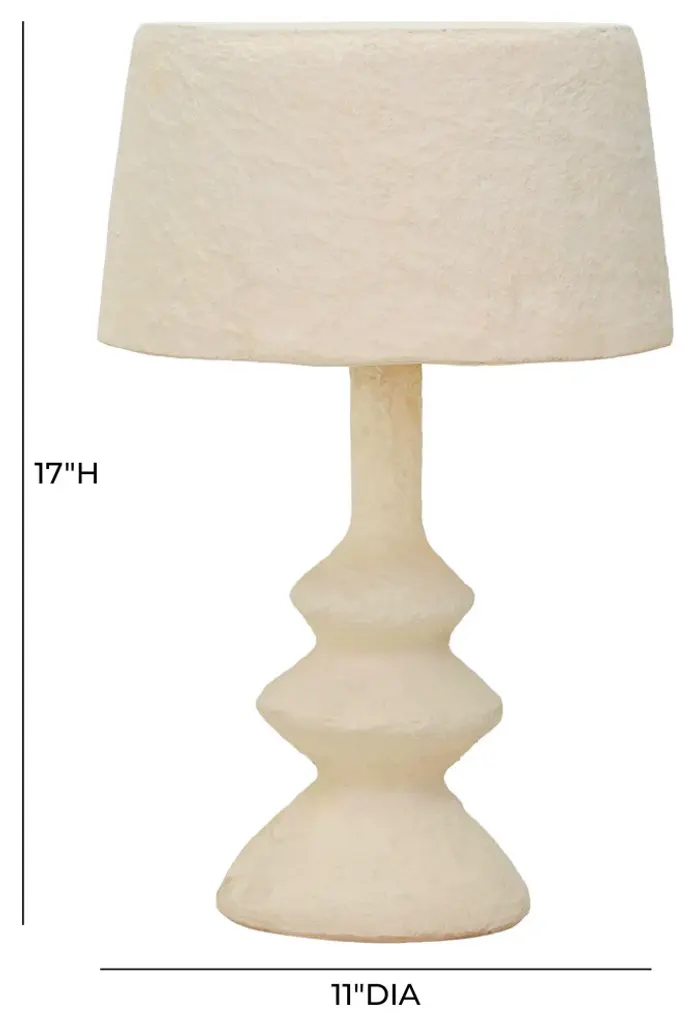 Meet the Cream Cotton Mache Table Lamp, a dreamy accent that adds an organic, soft touch to your space. Crafted from cotton mache, a more sustainable and unique take on the traditional papier-mache method, this lamp brings both charm and eco-conscious style to your home. Plus, it''s more durable and long-lasting, making it as practical as it is beautiful.- Handmade by skilled artisans in small batches, therefore, variations are to be expected- Made with cotton mache - more sustainable than papier mache- Minor assembly requiredPerfect for entryway, living room, or bedroom- Requires one Type A, max 7 watts LED bulb, with E26 base - Not Included- Plug-In & Push-Button- Cord Length: 98.4"- UL Listed