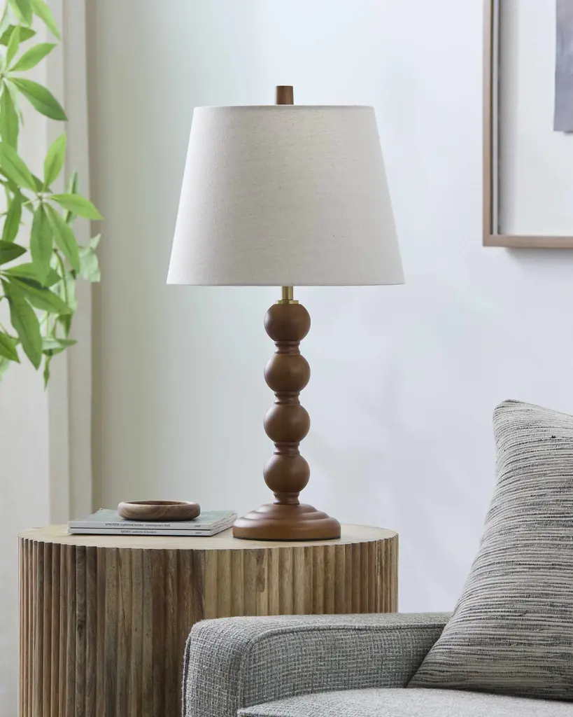 Collection: Cremenaga Colors: Dark Brown, Beige, White, Metallic - Nickel, Black Material: Body: Rubber Wood / Base: Rubber Wood / Shade (Outside): Linen / Shade (Inside): Polyester / Finial: Rubber Wood Styles: Traditional Made In: China Lighting Type: Accent Table Lighting Base: Rubber Wood Base Color: Dark Brown Shade Material: Linen, Polyester Shade Color: White, Beige Cord Length: 6' Switch Type: Rocker Number of Bulbs: 1 Socket Type: E-26 Bulb Wattage: 60W
