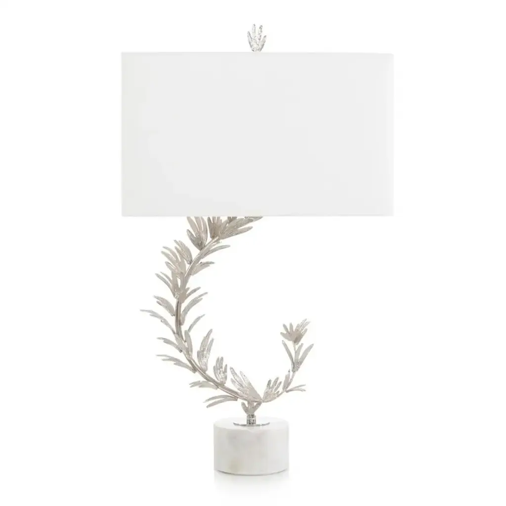 The Crescita Table Lamp is a stunning translation of nature’s beauty through the lens of modern design. Crafted from brass in a polished nickel finish, this three-way turnkey lamp takes the form of a gorgeous, crescent-shaped sapling showcasing delicate leaves throughout. The piece gently rests atop a rounded base of white marble, beautifully complementing the pristine metallic tones. A delicate, organically shaped finial perched atop the piece matches the body to complete the look.