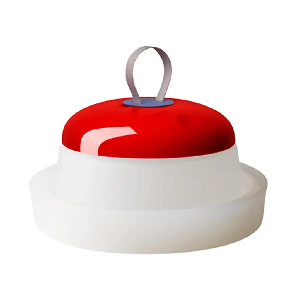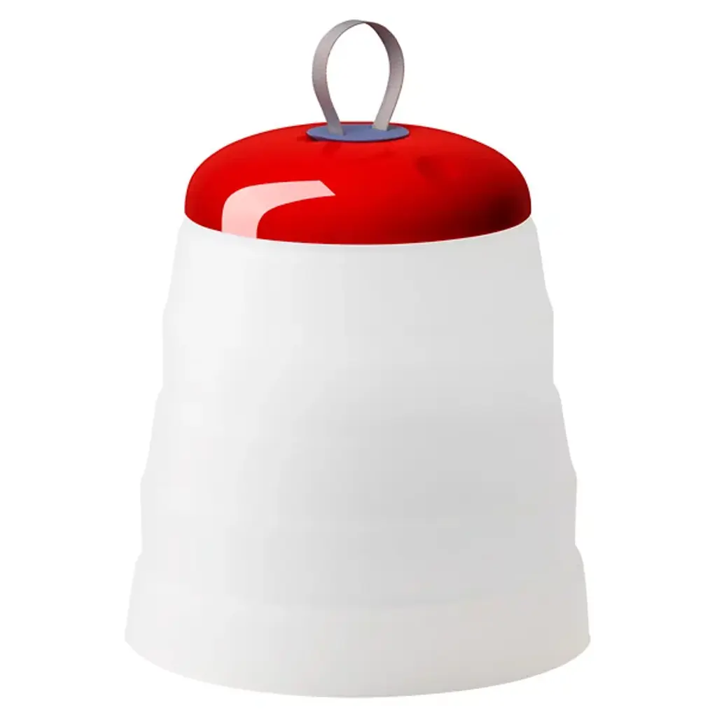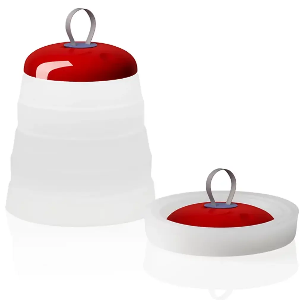 Memories of childhood picnics, family barbeques, and road trips are surfaced with the Cri Cri LED Rechargeable Indoor/Outdoor Table Lamp from Foscarini. Its bright colors and funky shape exude a childlike optimism that you don’t see every day, especially from a lighting fixture. The geometric shape of the base allows it to be folded in on itself for easy portability. This, combined with the internal rechargeable battery truly makes this a universal piece that can be used in any environment. Made from durable Silicone, PMMA, and ABS, this piece is wet-safe and can be used both indoors and out. The Green color option includes a White base, a Green cap with a Red seal, and a Grey hook. The Red color option includes a White Base, a Red cap with a Blue seal, and a Grey hook. This piece can be used anywhere- indoors or outdoors- and can easily be transported between the two.