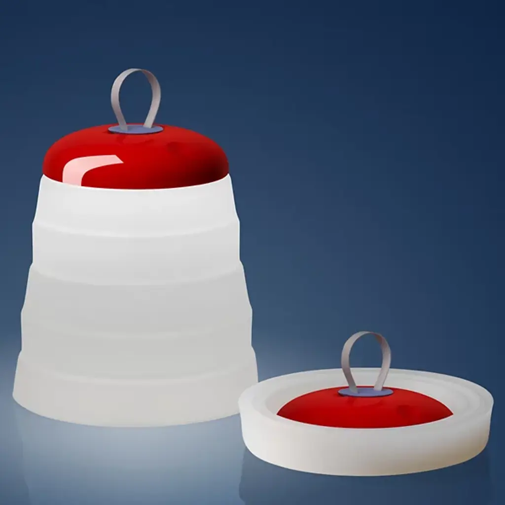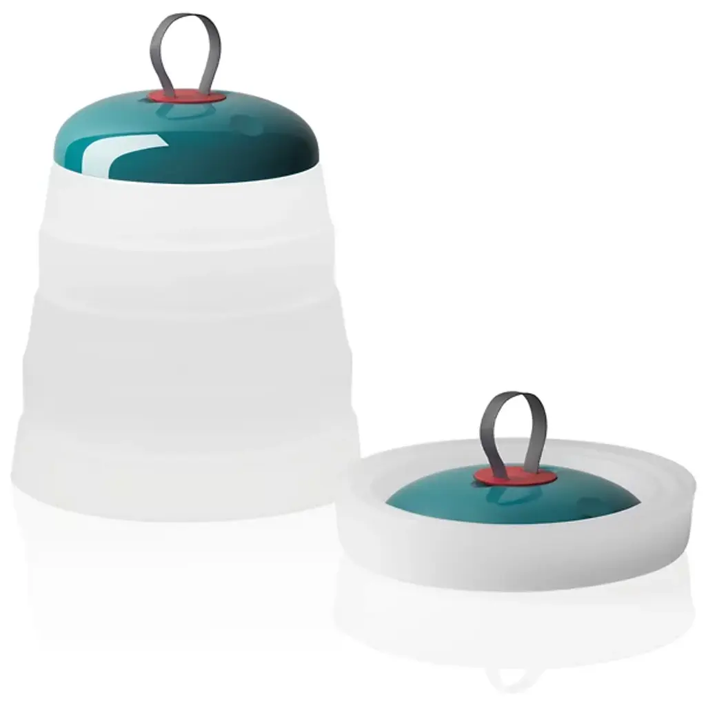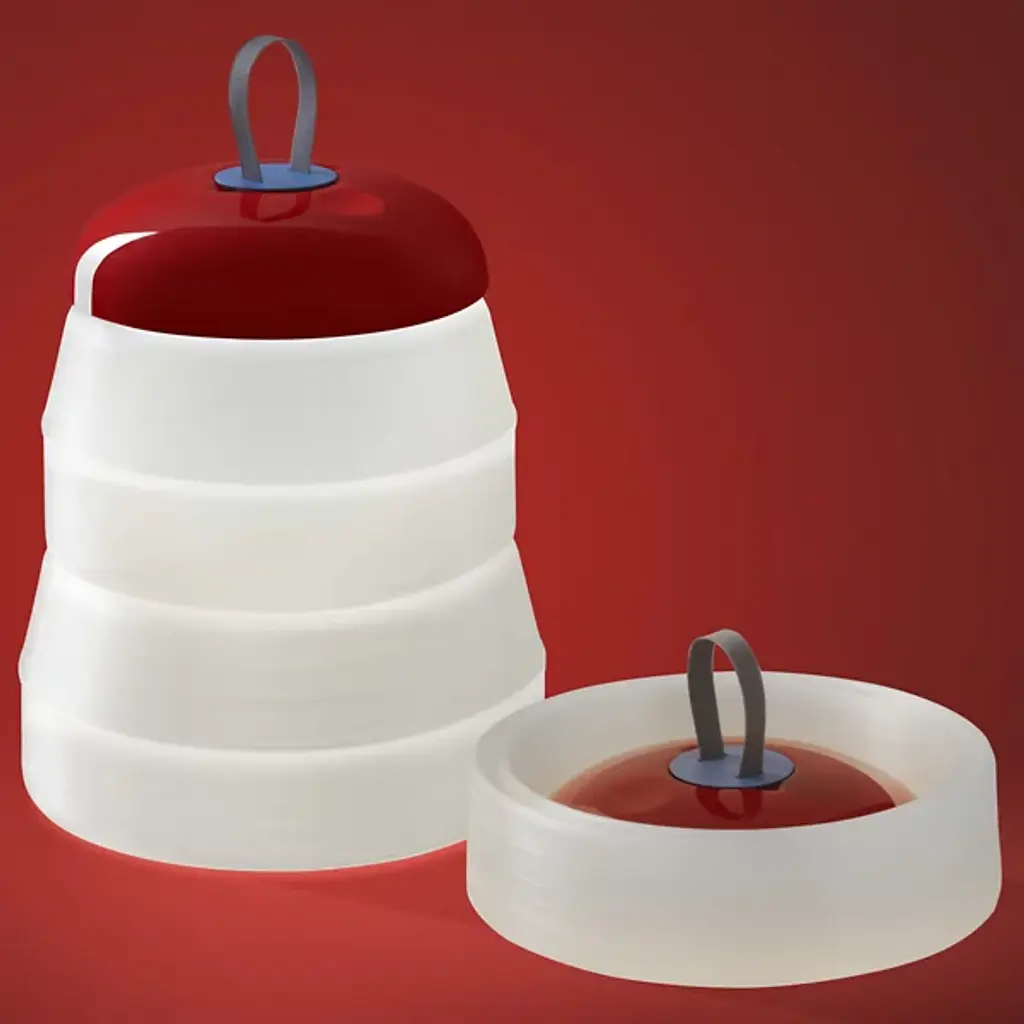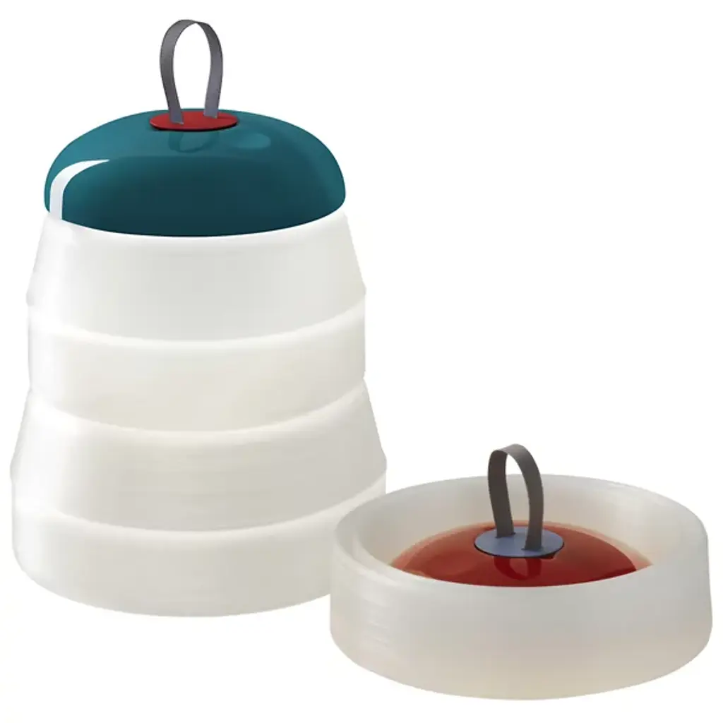 Memories of childhood picnics, family barbeques, and road trips are surfaced with the Cri Cri LED Rechargeable Indoor/Outdoor Table Lamp from Foscarini. Its bright colors and funky shape exude a childlike optimism that you don’t see every day, especially from a lighting fixture. The geometric shape of the base allows it to be folded in on itself for easy portability. This, combined with the internal rechargeable battery truly makes this a universal piece that can be used in any environment. Made from durable Silicone, PMMA, and ABS, this piece is wet-safe and can be used both indoors and out. The Green color option includes a White base, a Green cap with a Red seal, and a Grey hook. The Red color option includes a White Base, a Red cap with a Blue seal, and a Grey hook. This piece can be used anywhere- indoors or outdoors- and can easily be transported between the two.