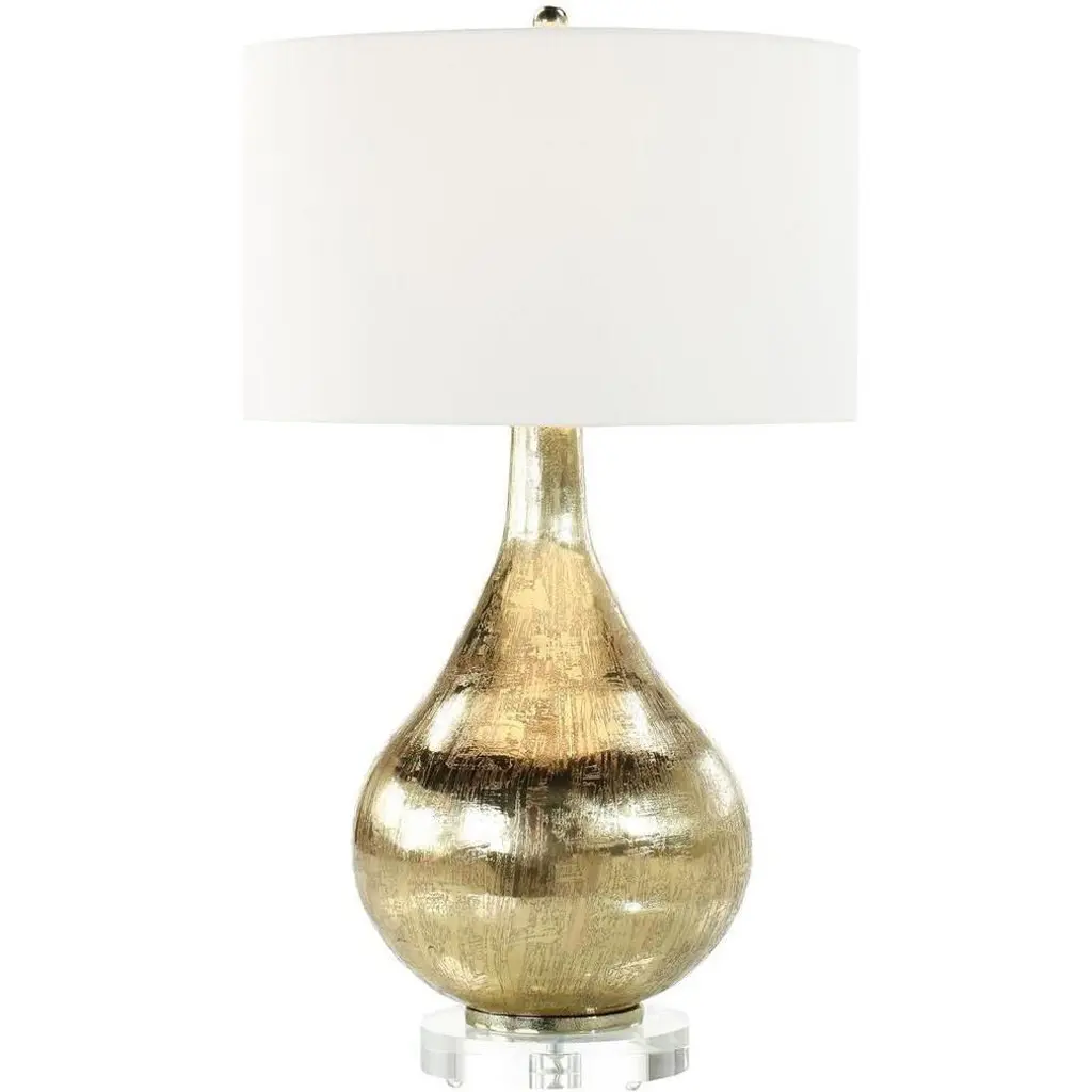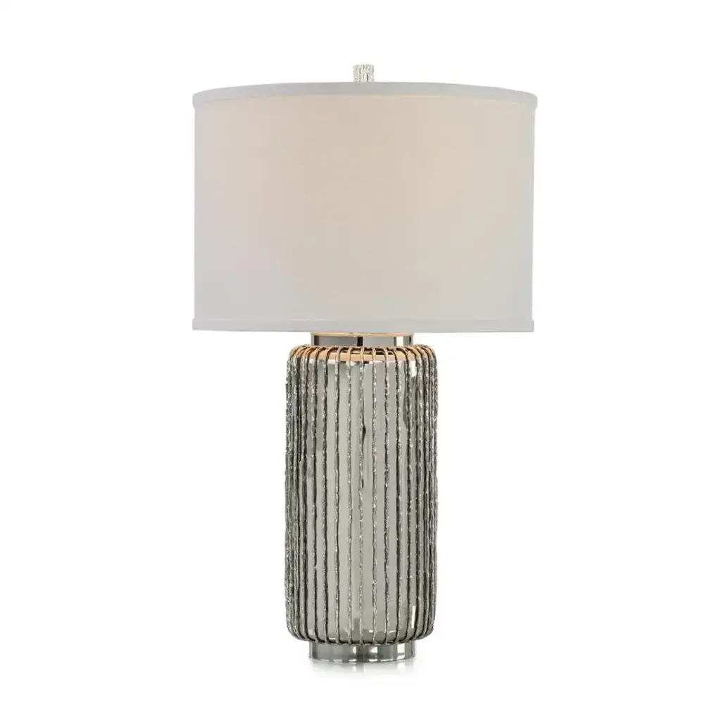 The Crista Table Lamp is an opulent design statement rich in visual depth. This Polished Nickel lamp features a cylindrical shape, with textural striations running vertically throughout. This piece features a textured finial, matching the body, and a round white drum shade.