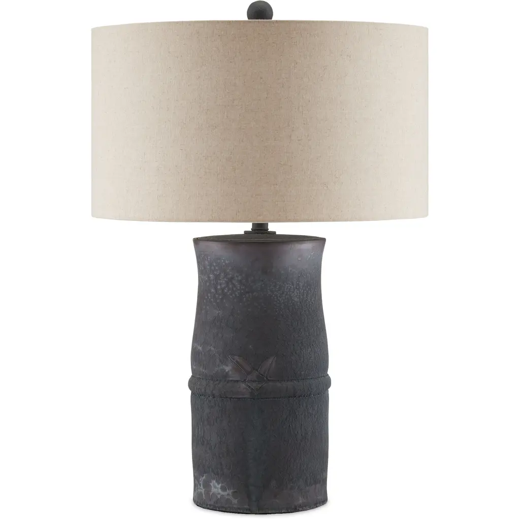 Designed by Clarence Mallari, the Croft Table Lamp is a rough luxe offering made of ceramic in a satin dark gray finish. The textural surface has a slight curve as it nears the shade, a central ring that bulges from its profile, and a very subtle leaf motif that is carved into its body at intervals. The pitting on the surface of this dark gray lamp will be a textural introduction to a space.