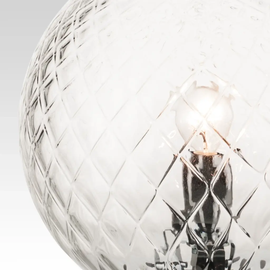 The particular cross-relief effect from which the models in this collection take their name is obtained with the “balloton" technique. During the hot working phase, the master blows the glass into a metal mold, the inside of which is studded with pyramid-shaped points: the material, filling the void, shapes itself, covering itself with this particular texture. Table lamp available in the version with glass base, fabric lampshade and lacquered metal structure or with glass diffuser and chromed metal base.