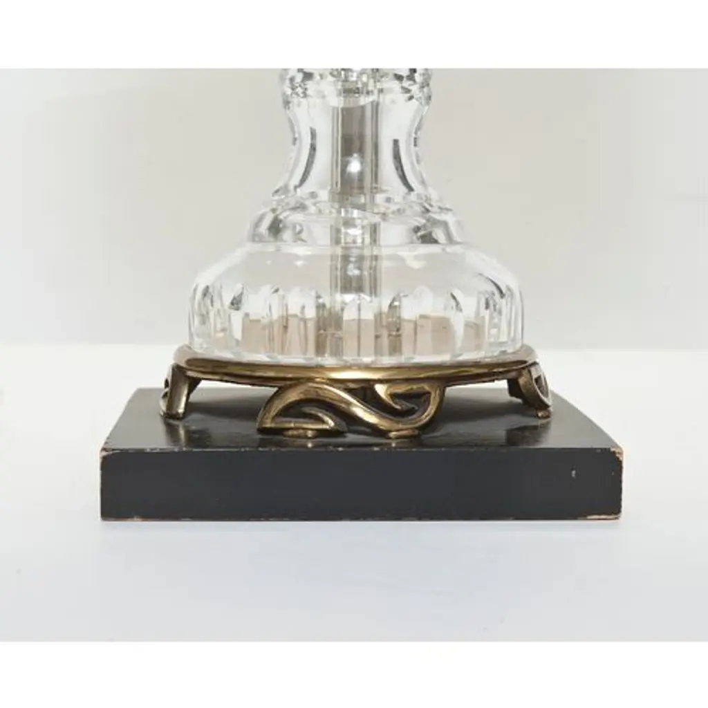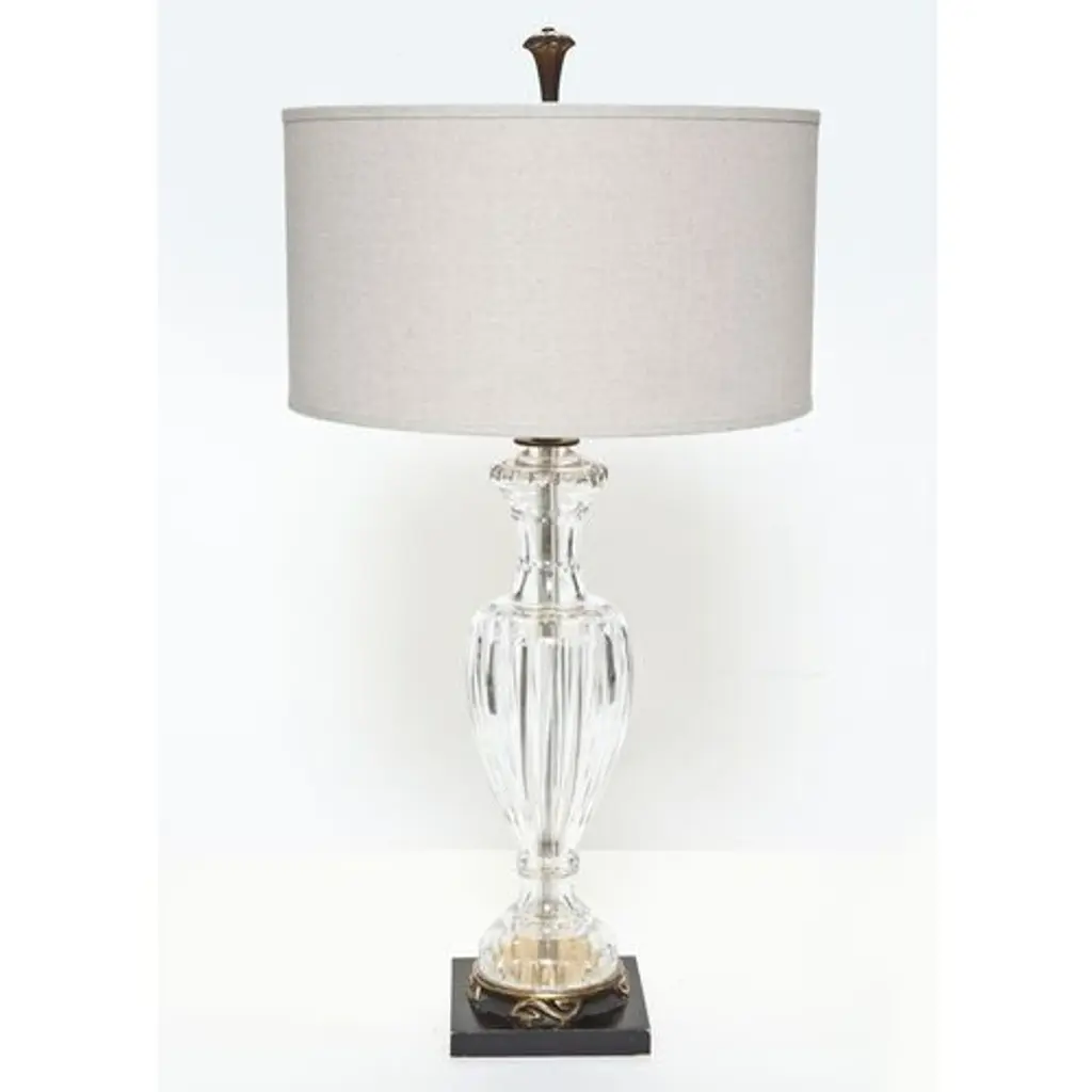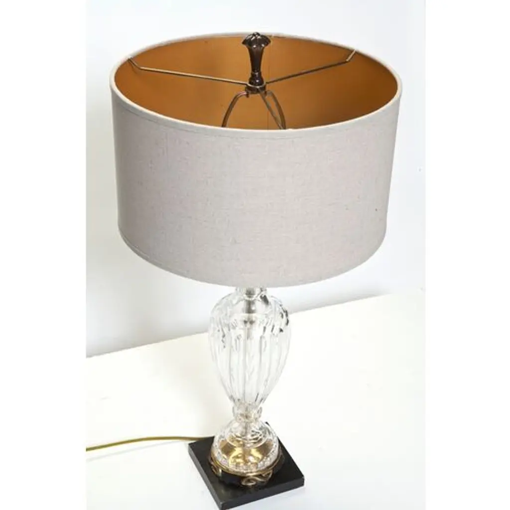 Stunning crystal table lamp with ebony & brass base & tall faceted finial. Gold linen linen barrel shade is included.