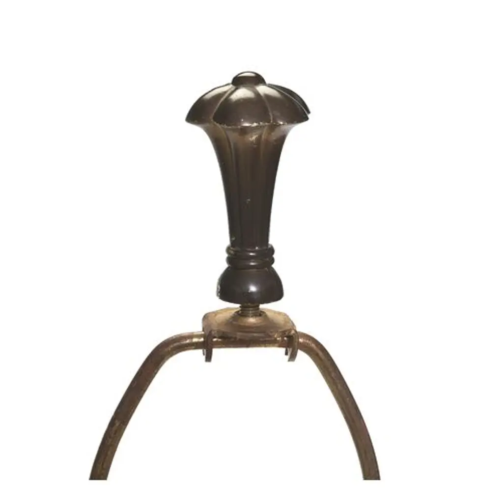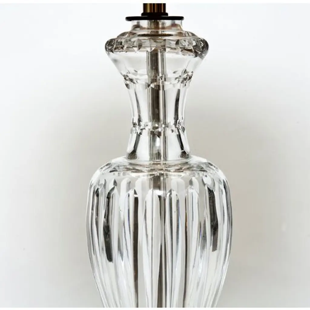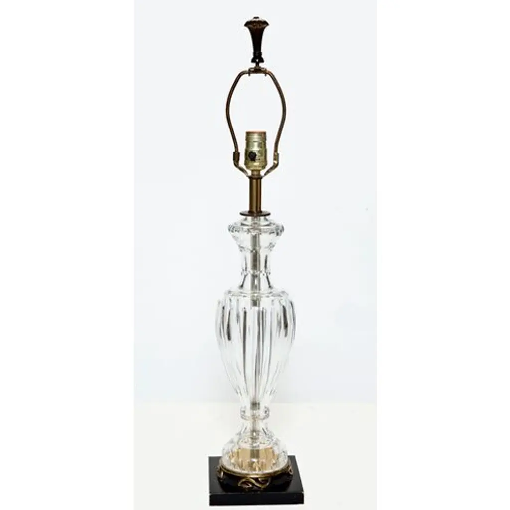 Stunning crystal table lamp with ebony & brass base & tall faceted finial. Gold linen linen barrel shade is included.