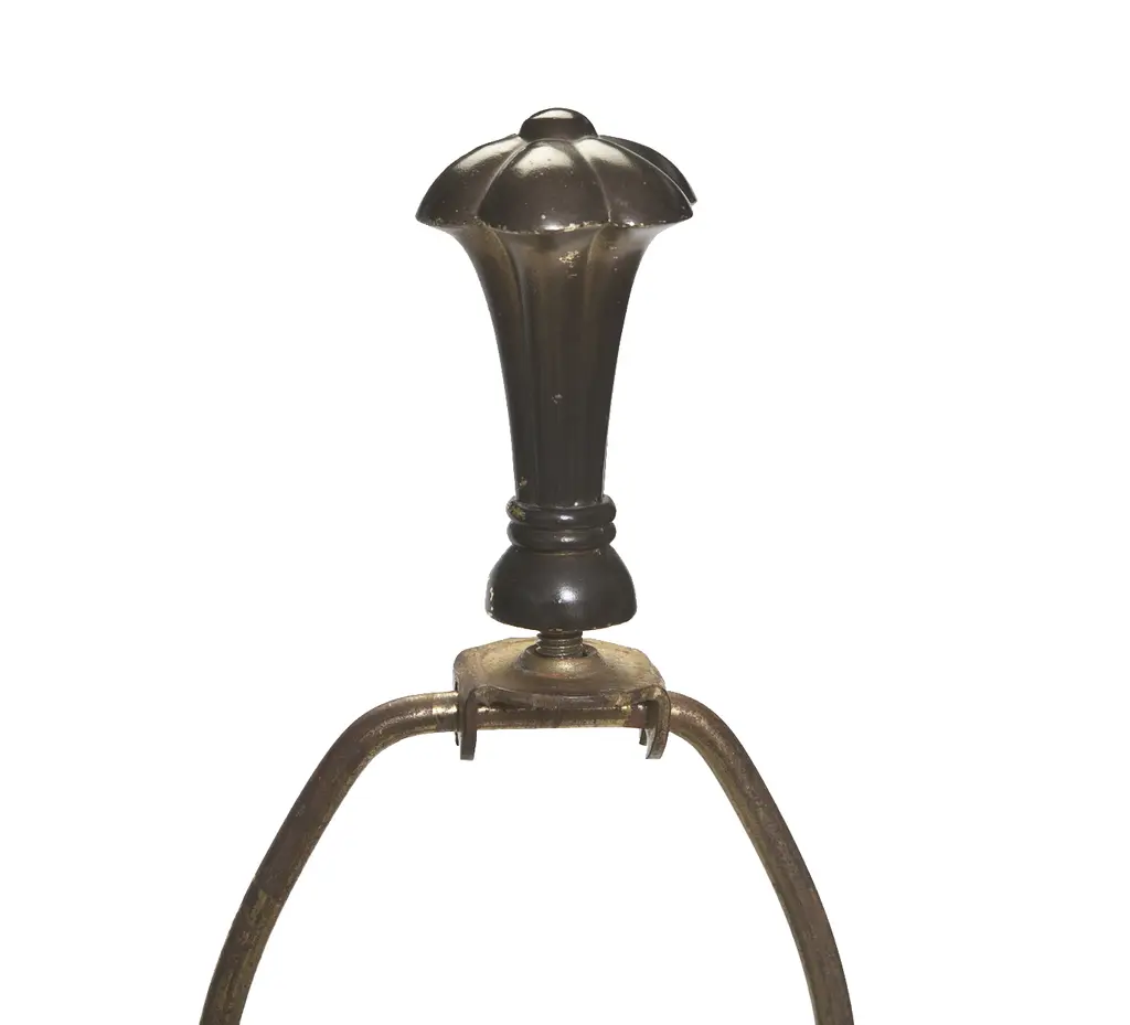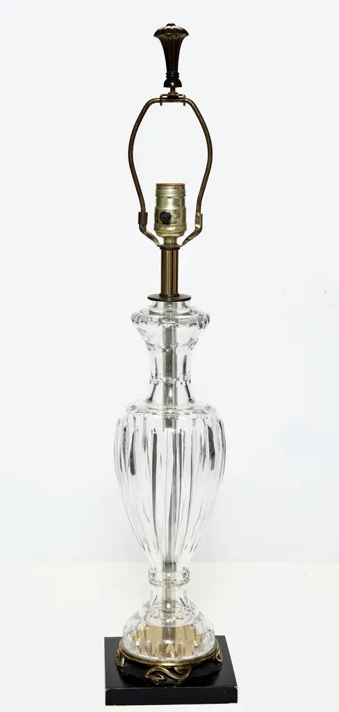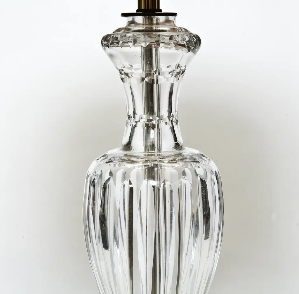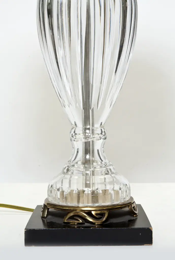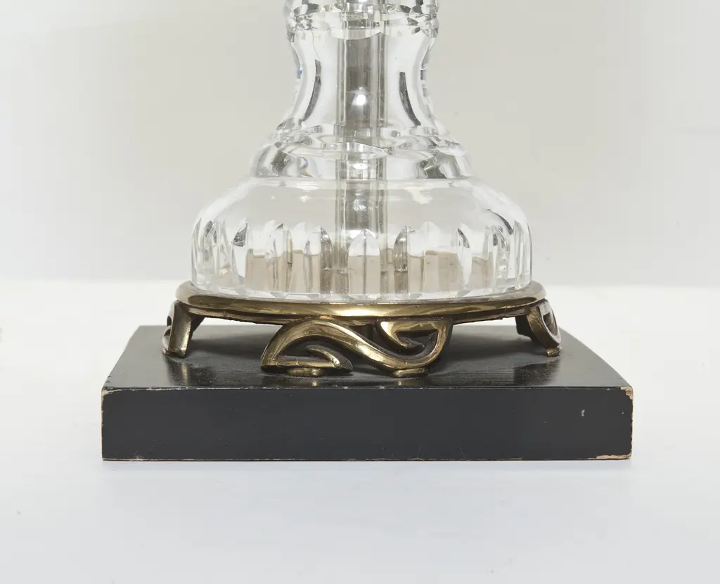 Stunning crystal table lamp with ebony & brass base & tall faceted finial. Gold linen linen barrel shade is included.