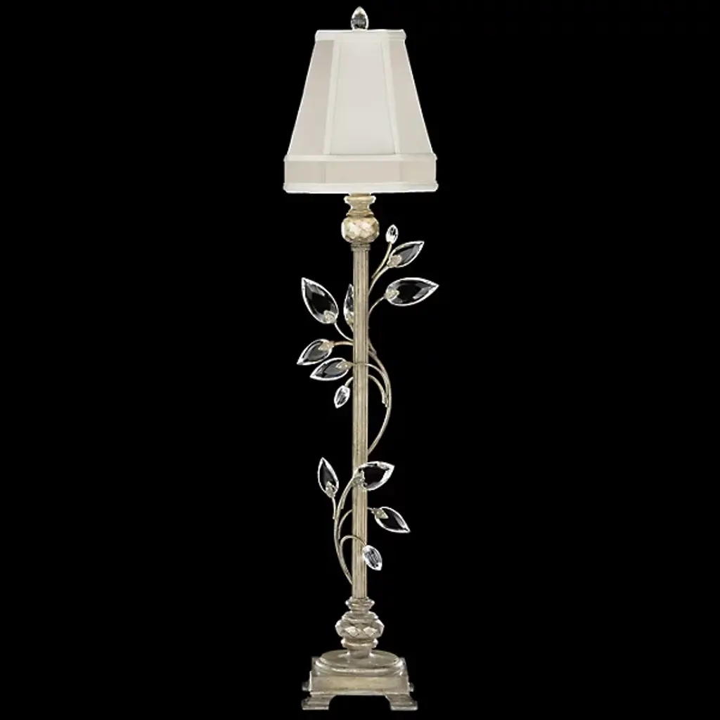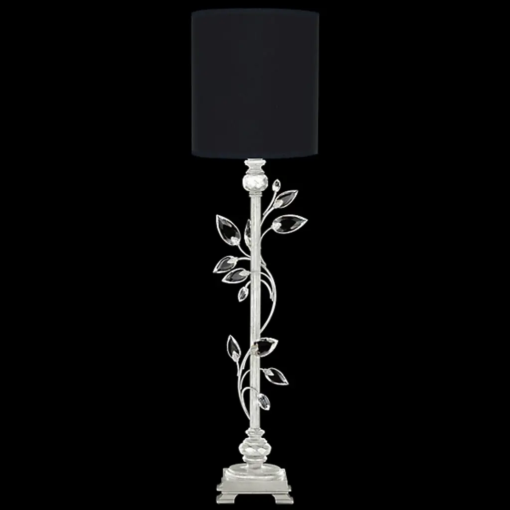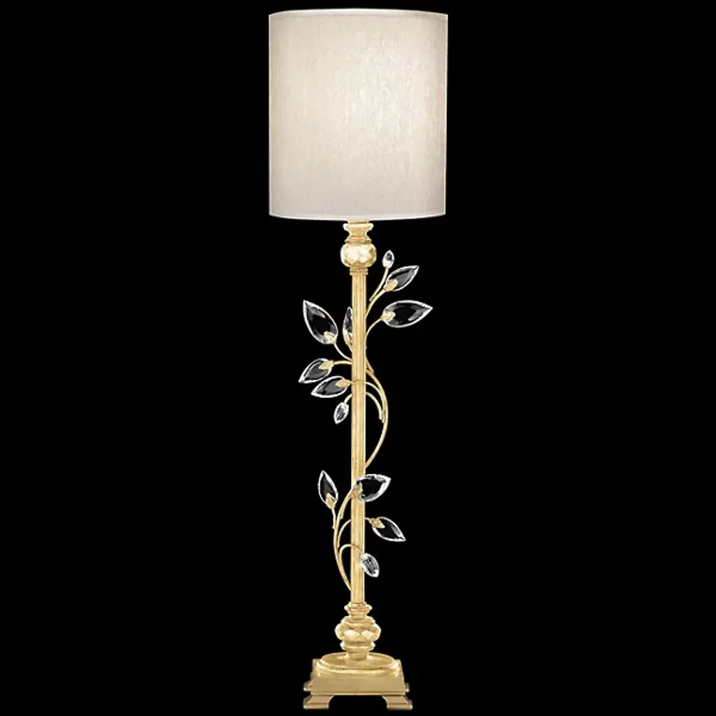 Make an elegant, avant-garde addition to interiors with the organic décor of the Crystal Laurel Gold Table Lamp from Fine Art Handcrafted Lighting. A four-legged metal platform sends a slim central stem to a single candelabra. Stylized crystal leaves curl up and around the stem in a gestural quality. The lamping is restrained by a translucent shade, reducing direct glare to a pleasing warmth that glitters off the crystal leaves.