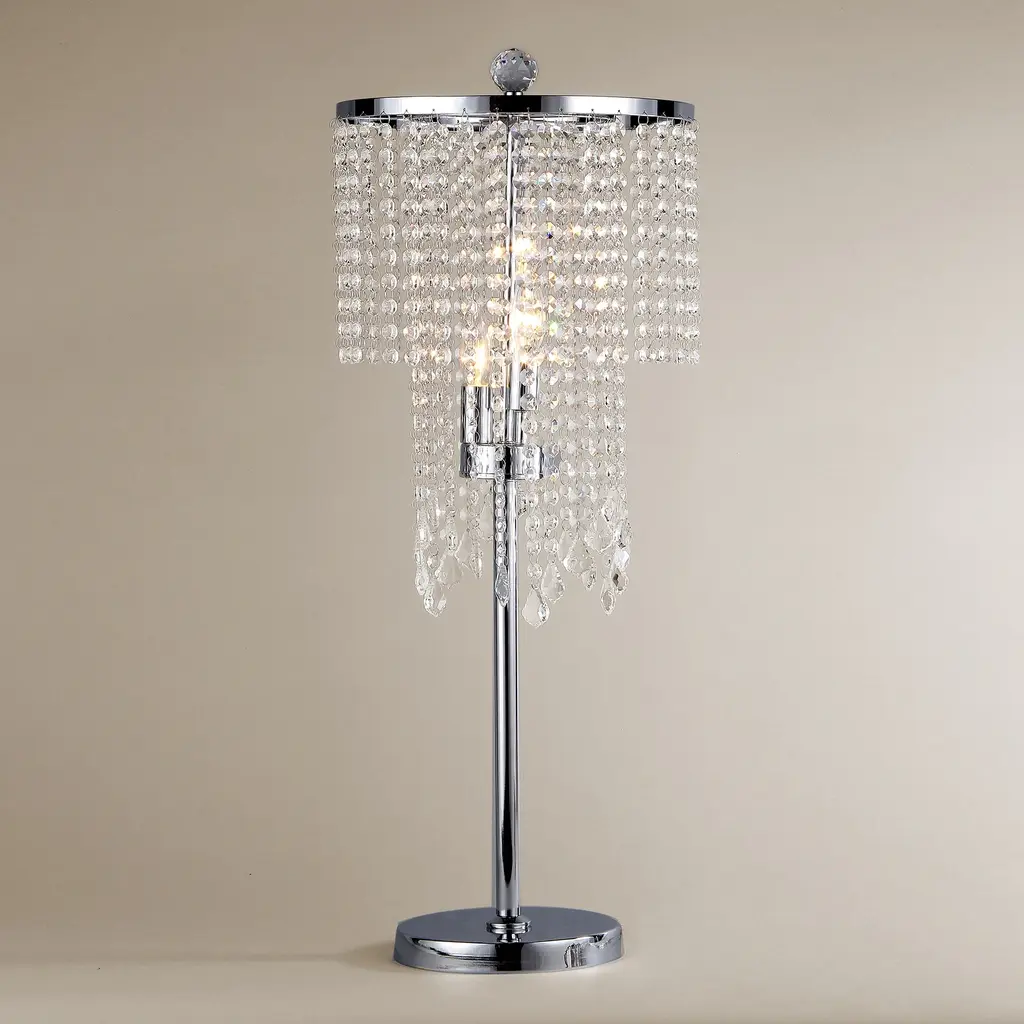 Adorn any night stand or side table with this indoor table lamp, featuring a reliable metal frame for great durability. The practical inline switch allows you to quickly turn it on and off, and three upward lights provide generous lighting for your relaxing reading sessions or romantic dates.Make a statement with unparalleled elegance and confident style with this exquisite table lamp. Its shiny chrome finish speaks of modernity and efficiency, while the countless crystal pendants create mesmerizing reflections and shimmering tricks of light that don't fail to impress guests and friends. The round, simple design softens the flashy look of this piece for a more composed, interesting appeal.Three-light 31H x 12D indoor table lampRequires three 40W bulbs (not included)Inline switch is handy and easy to useChrome fixture finish and crystal accents add brightness and refinementDimensions: 31" in height inches x 12" in diameter at shadeThis fixture does need to be hard wired. Professional installation is recommended.