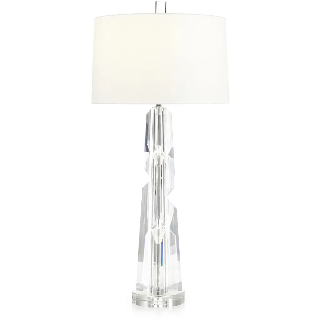 This gorgeous turnkey table lamp showcases a stunning body of crystal with triangular grooves carved into the sides. The base and finial, also of crystal, perfectly complement the transparent body to result in a sleek, modern statement piece. A slender rod of iron in a polished nickel runs through the body of the piece to act as the neck, providing playful juxtaposition and completing the look.