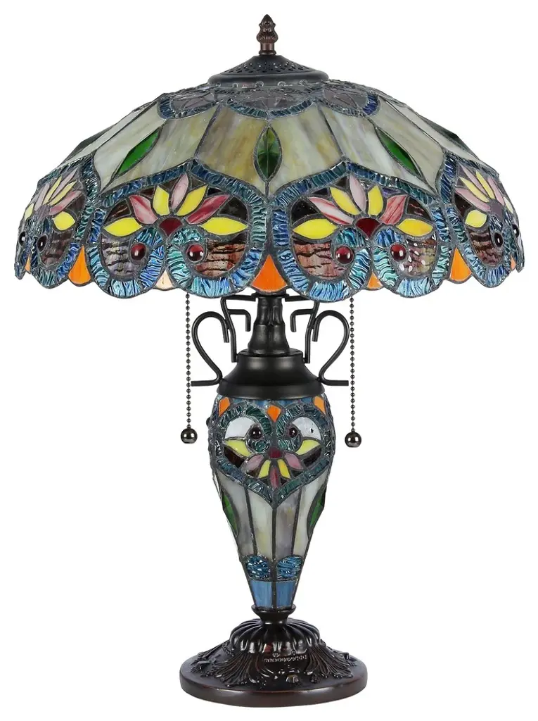This Tiffany-style Victorian design 3-light with matching base table lamp features a dark bronze finish and a lighted base that will complement many decors throughout your home. Hand crafted from individually hand cut pieces of art glass that will add color and beauty to any space.(2) 60 Watt max E26 Type A Bulb + 1-Max 25 Watt E12 Type C Bulb (Type A bulb not included) Pull chain & on-cord rotary switch502pcs glass cut, 22 beads, 11 crystalsDownlightIndoor SettingGlass &/or Fabric Color: Multi-coloredShape: RoundBulb Type: Incandescent; LED; Compact Fluorescent (CFL)Max Wattage: 60;25Bulb Base: E26 Medium;E12/CandelabraBulb Shape: A19; C10Additional Warning or Disclaimers: Since these are hand crafted products, the exact color of glass pieces may vary. Colors of the glass will appear darker and less vibrant when not illuminated. Handmade glass will vary from one piece to the other; glass made at different times will also vary. Light bulbs used in lamps or ambient lighting may affect the appearance of the products. Stained glass product has been protected with mineral oil as part of the finishing process. Please use a soft dry cloth to remove any excess oil.UL Certification #: E345256