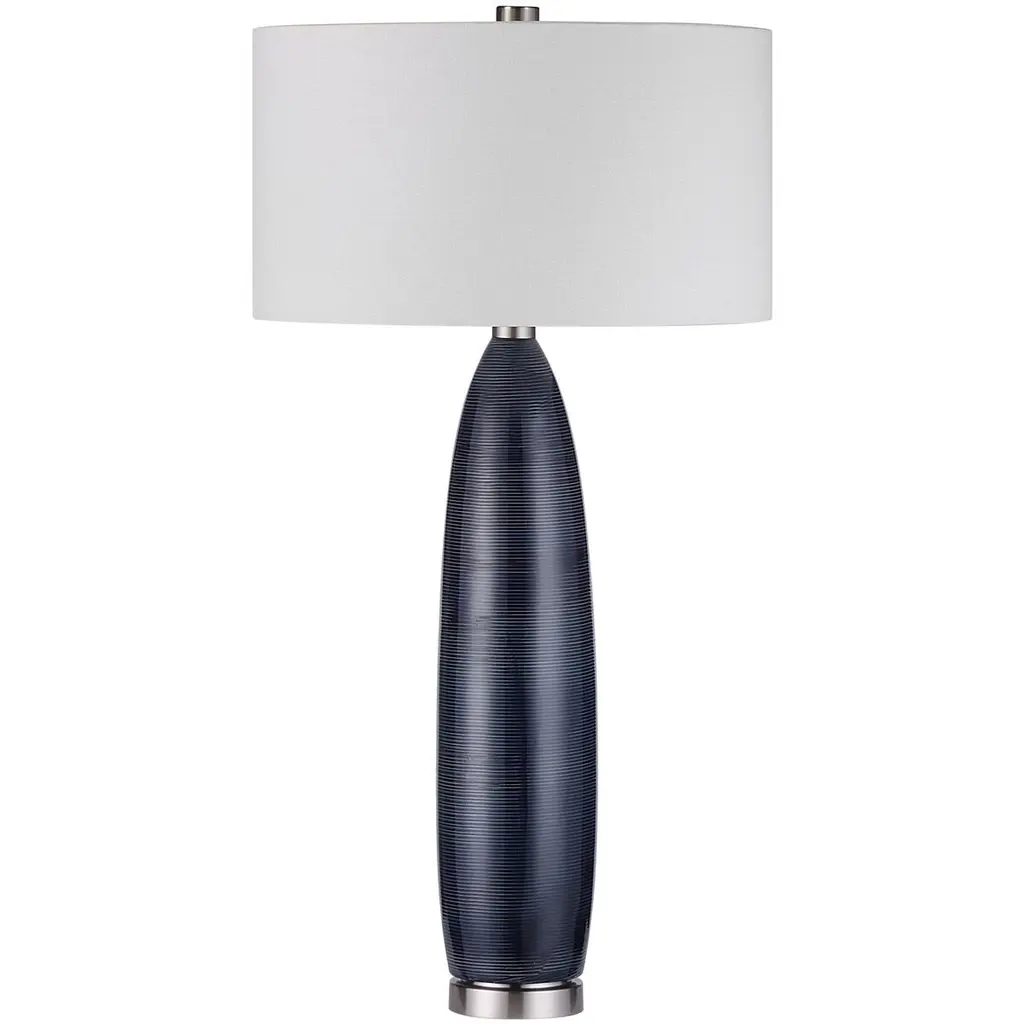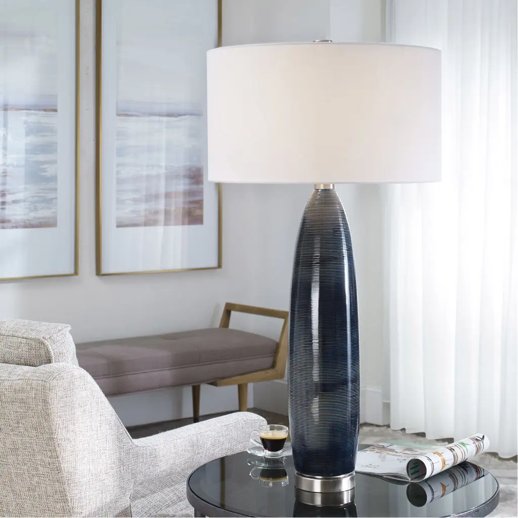 This Handcrafted Ceramic Table Lamp Showcases An Elevated Look With A Striped Motif And A Prussian Blue-gray Glaze. Brushed Nickel Plated Iron Details Accentuate The Design. The Hardback Drum Shade Is Covered In A White Linen Fabric.