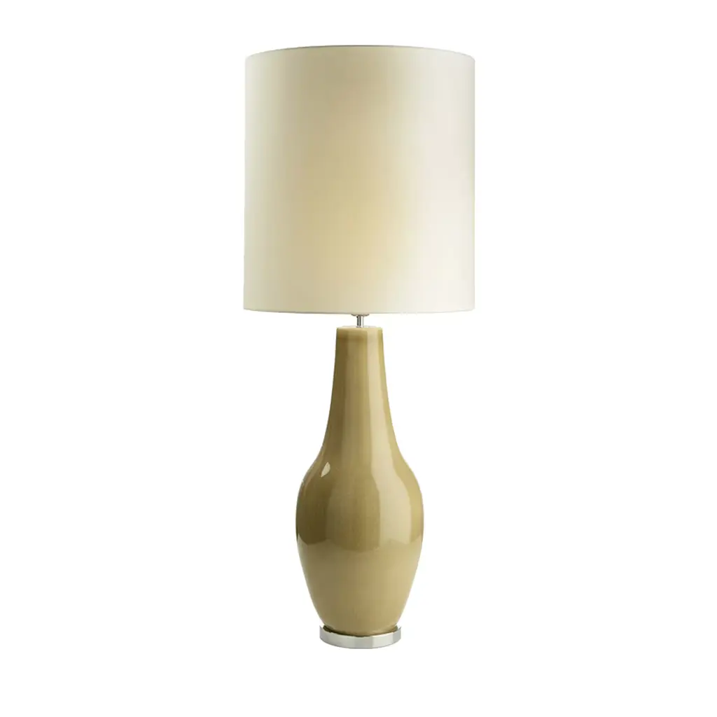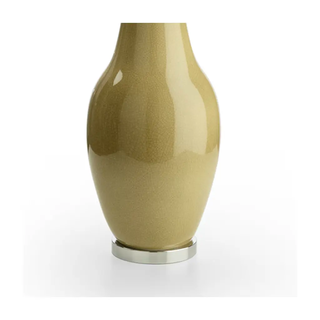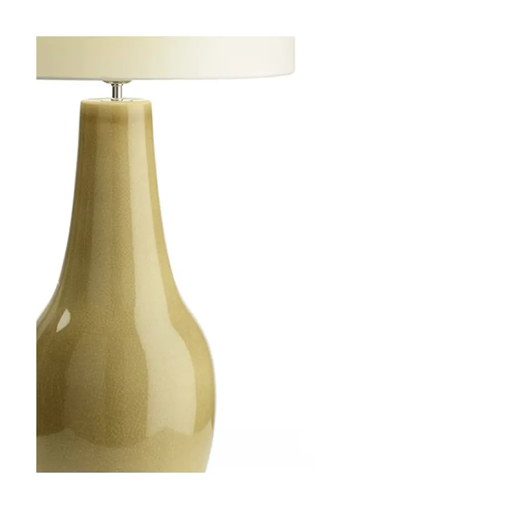 Crafted entirely of ceramic, the structure of this elegant table lamp is elongated and charming, in a delicate shade of beige and with a crackle glaze finish. Resting on a metal round base, this piece is completed with a fabric shade and will be a charming, sophisticated accent in both classic and contemporary decors. Its finishes and color combinations can be changed. Please ask the concierge for details and changes in prices with customization.