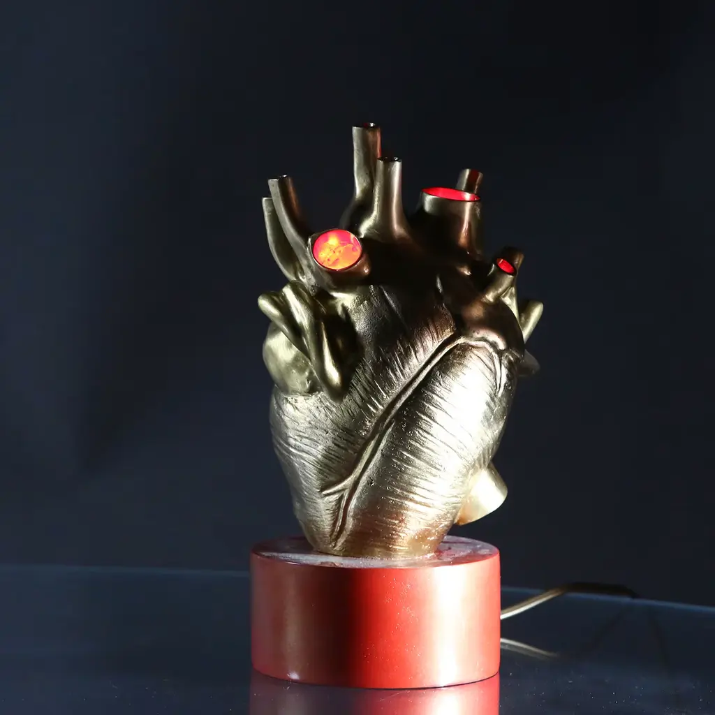 Crafted in satin-finished yellow bronze, this sculpture lamp features a lifelike heart design with multiple light points. Its multicolored bronze base adds artistic flair, complemented by a lamp fixture. A captivating fusion of art and light, perfect for adding sophistication to any space.