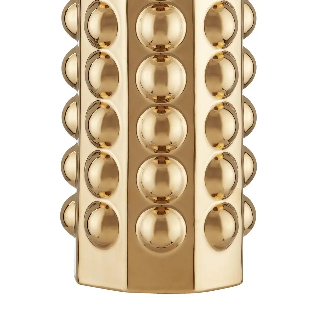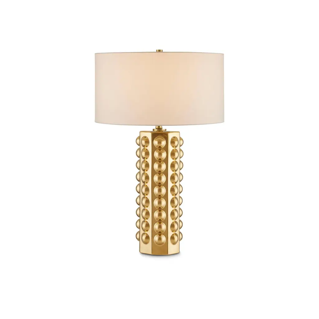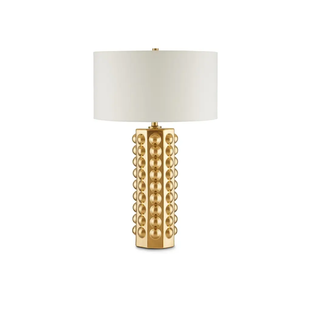 The Cassandra Gold Table Lamp, made of ceramic in a shimmering gold finish, exudes a playful charm that blends a touch of swinging seventies style with contemporary flair. Featuring a knobby profile, it brings depth and character to any space. Paired with a light-beige shantung drum shade, this lamp offers both visual impact and substantial presence.