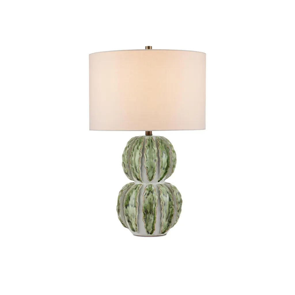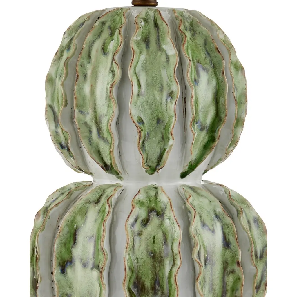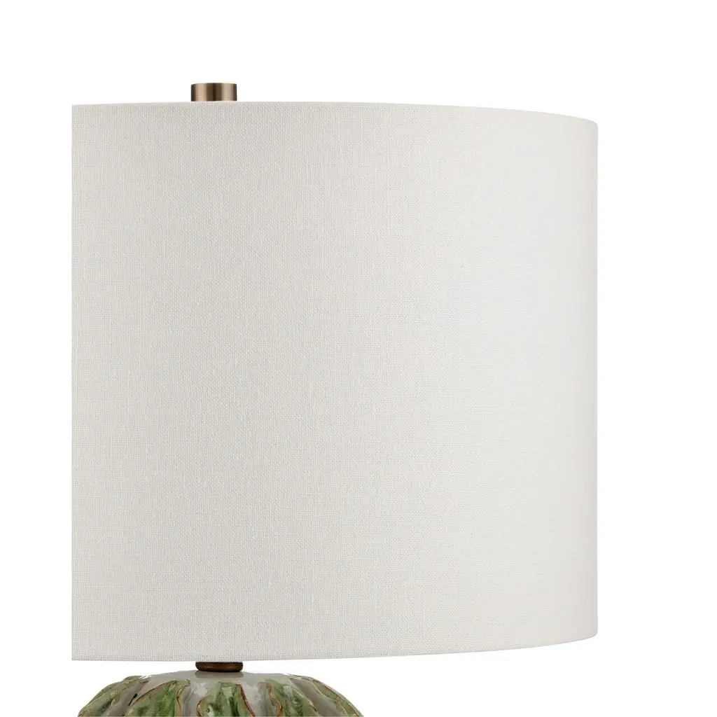 The Kolonos Table Lamp's double-gourd-shaped body is made of ceramic in a mix of white and green glazes. Made by a group of women who live at the border of Burma and Thailand, this complex design has scalloping details that are manipulated by hand to form the raised decorations before the ceramic is beautifully glazed. The nature-inspired design is topped with an off-white linen shade.