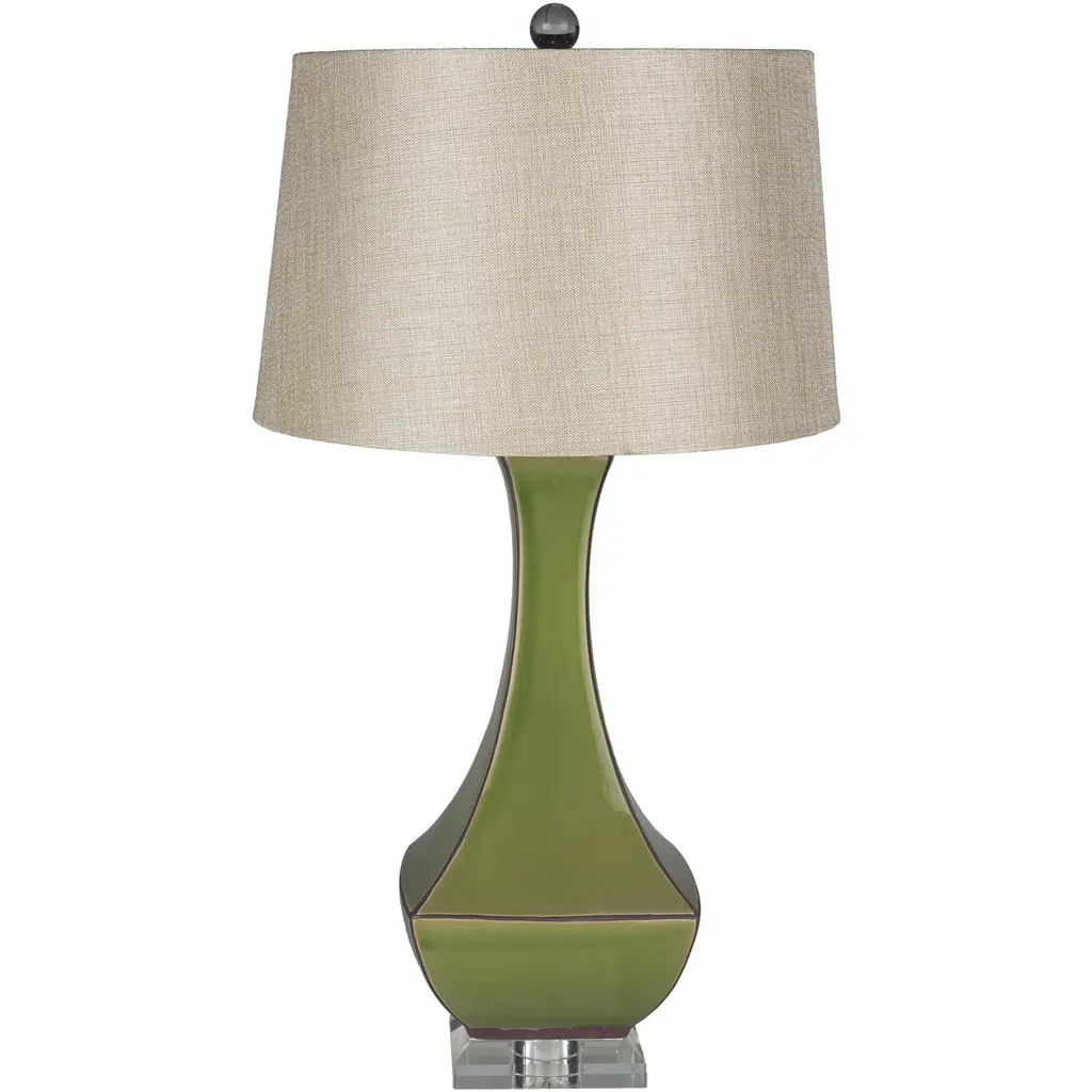 The Upbeat Orange Table Lamp is mod in style. The shapely terracotta body has a center ball with cones extending up toward an off-white linen shade and downward to its culmination. The shade is fastened with a wrought iron finial. The Upbeat also comes in teal, yellow, and white.