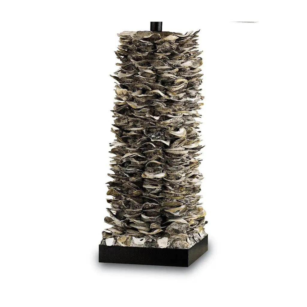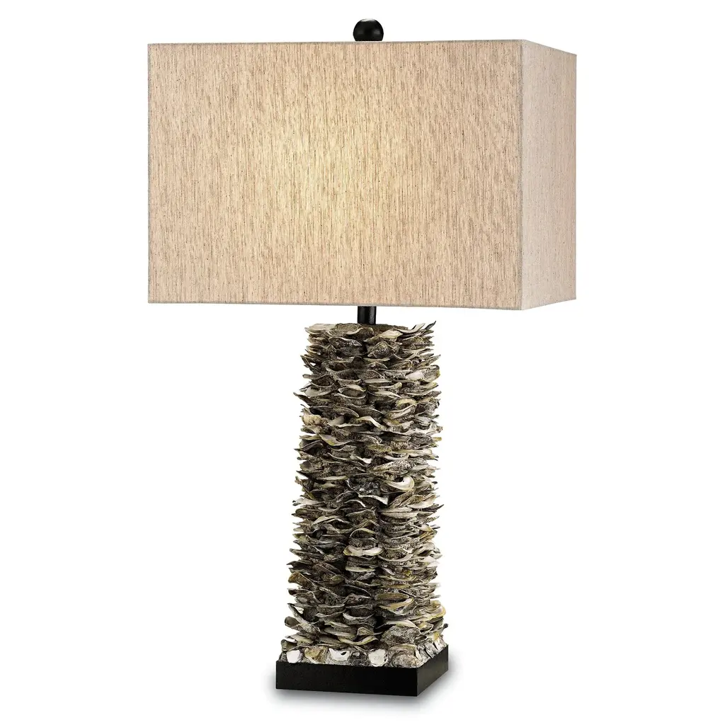 Stacked Oyster shells applied by hand to the pedestal of the Villamare Table Lamp create a textural column rising from a satin black wood base. This is one of our painstakingly hand-applied artisanal pieces. The shell table lamp is topped with an oatmeal linen shade.