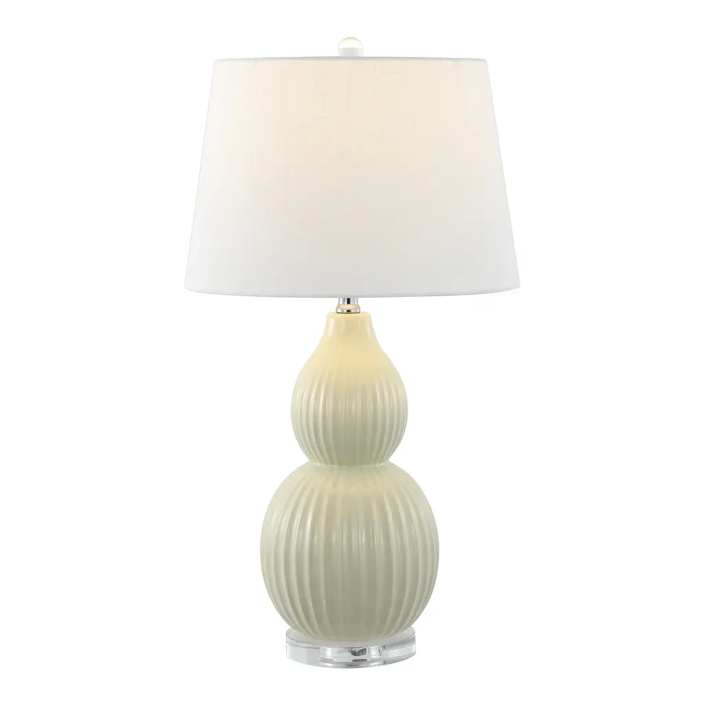 An exciting table lamp features a double-gourd body in glossy white with an accent of textured gold atop an acrylic base.