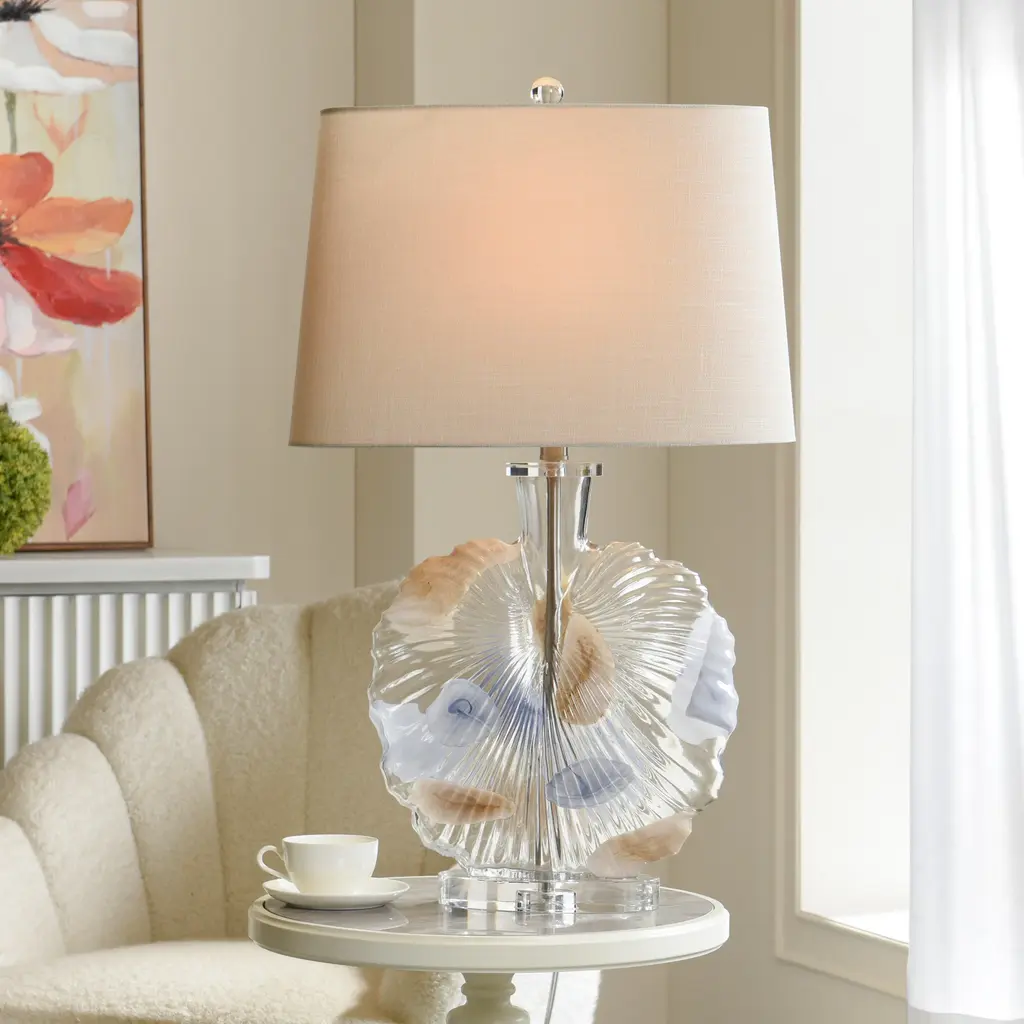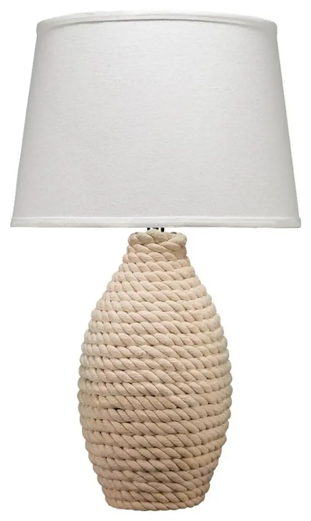 Casual and coastal, this table lamp is made of white rope bringing the seashore inside. The cone shade is cream linen. Very few threads of mixed material and color may be intertwined in jute rope as a result from the production process in rare instances. Natural rope will fray slightly.16.5"L x 16.5"W x 28"H. Weighs 8 lbs.Natural Jute Rope Wrap. Linen Fabric Shade.UL listed. Uses one max 150W Type A bulb (not included). 3 way socket switch.Heirloom Quality - Expertly hand crafted and hand finished. Due to the hand crafted nature of this piece, each piece may have subtle differences.