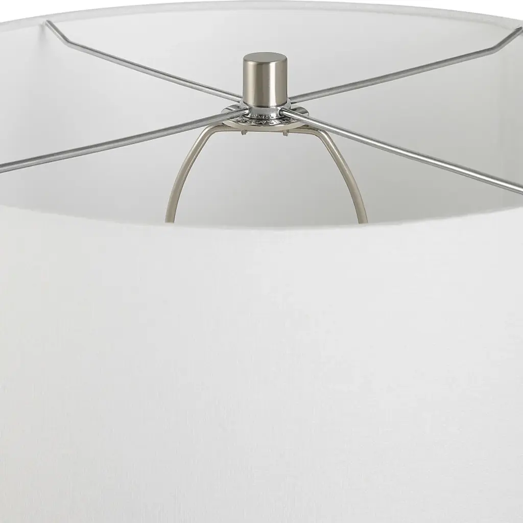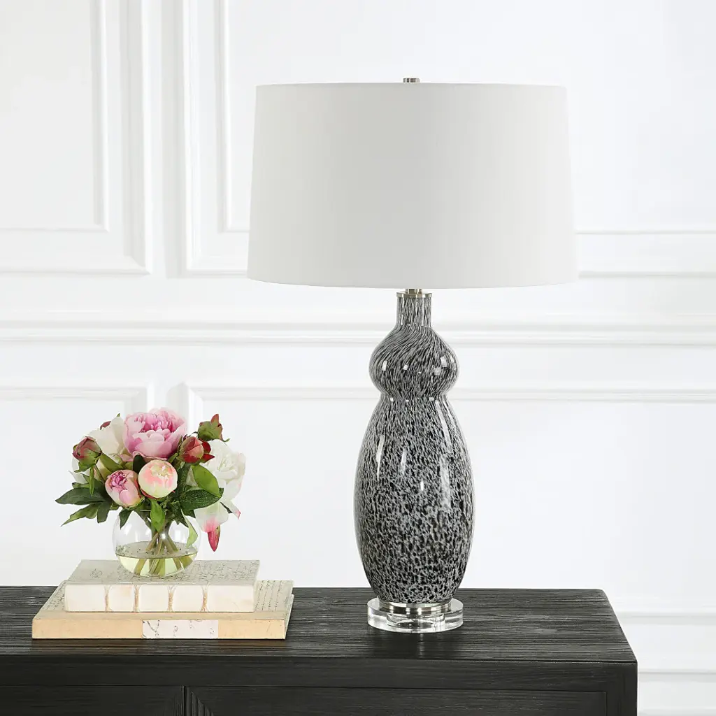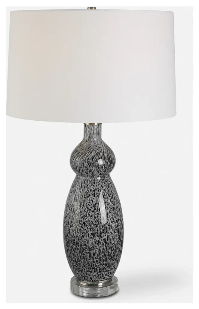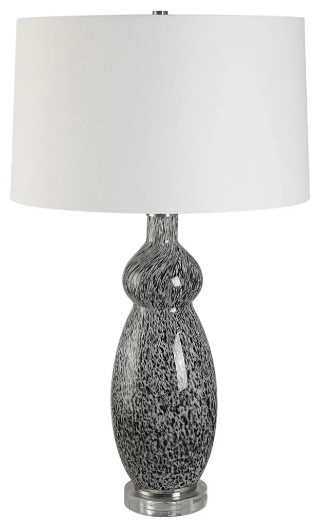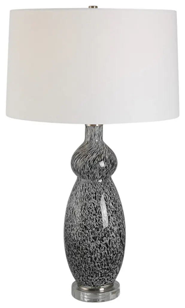 This curvy glass base features a soft gray background with mottled black details displayed on a thick crystal foot with plated brushed nickel accents. The slightly tapered drum shade is covered in a crisp white linen fabric. Due to the nature of fired glazes on ceramic lamps, finishes will vary slightly.17"W x 17"D x 29"H. Weighs 10 lbs.Hand Finished Art Glass and Crystal. Linen Fabric Shade.UL listed. Uses one max 150W Type A bulb (not included). 3 way socket switch.Heirloom Quality - Expertly hand crafted and hand finished. Due to the hand crafted nature of this piece, each piece may have subtle differences.
