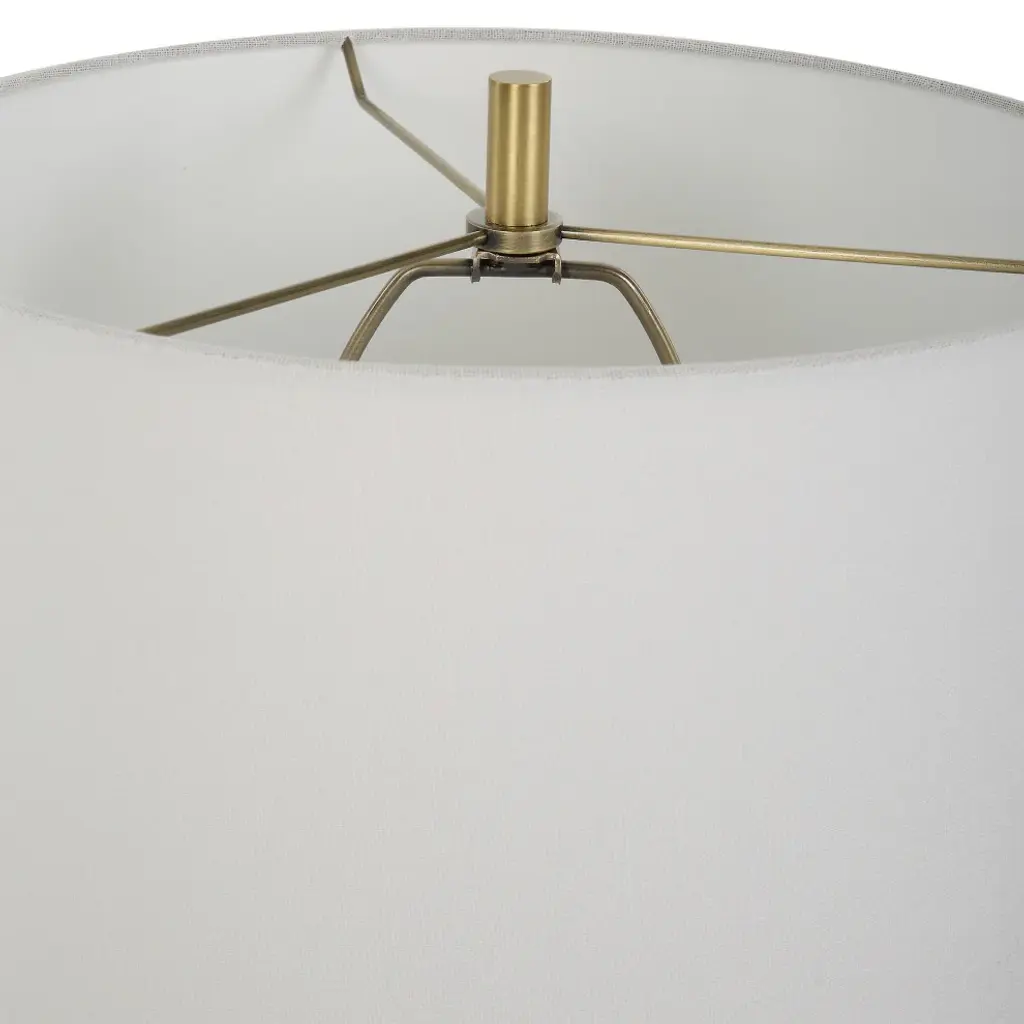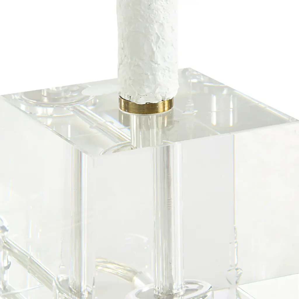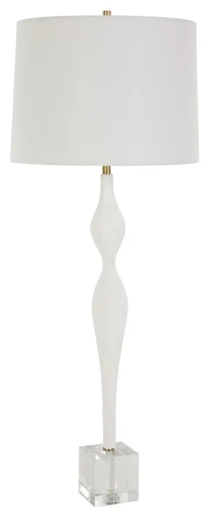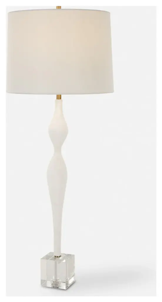 Our table lamp showcases a slender chalk white ceramic base with feminine curvature and a plaster like texture. A thick square crystal foot adds to the sophistication of this design along with antique brass plated accents. The hardback shade has a slight taper and is covered in a white linen fabric.14"W x 14"D x 36"H. Weighs 10 lbs.Hand Finished Ceramic. Linen Fabric ShadeUL listed. Uses one max 150W Type A bulb (not included). Three way switch at socket.Heirloom Quality - Expertly hand crafted and hand finished. Due to the hand crafted nature of this piece, each piece may have subtle differences.