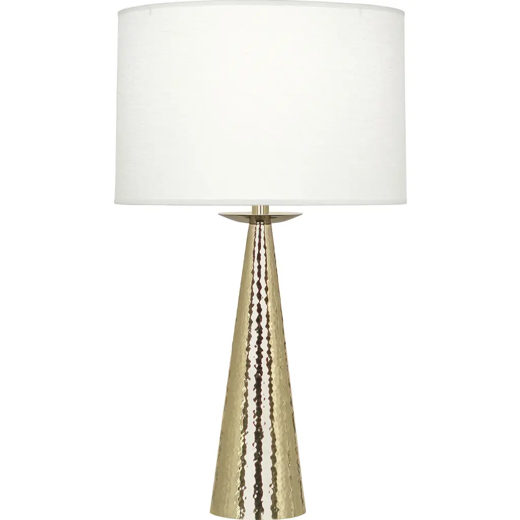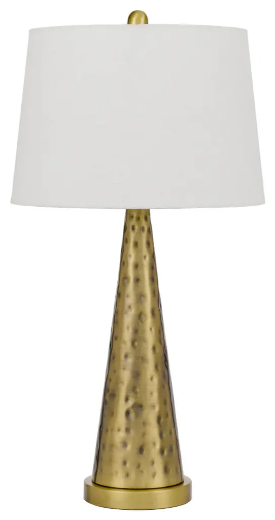 Illuminate your space with this modern hammered metal table lamp. It features a polished brass finis