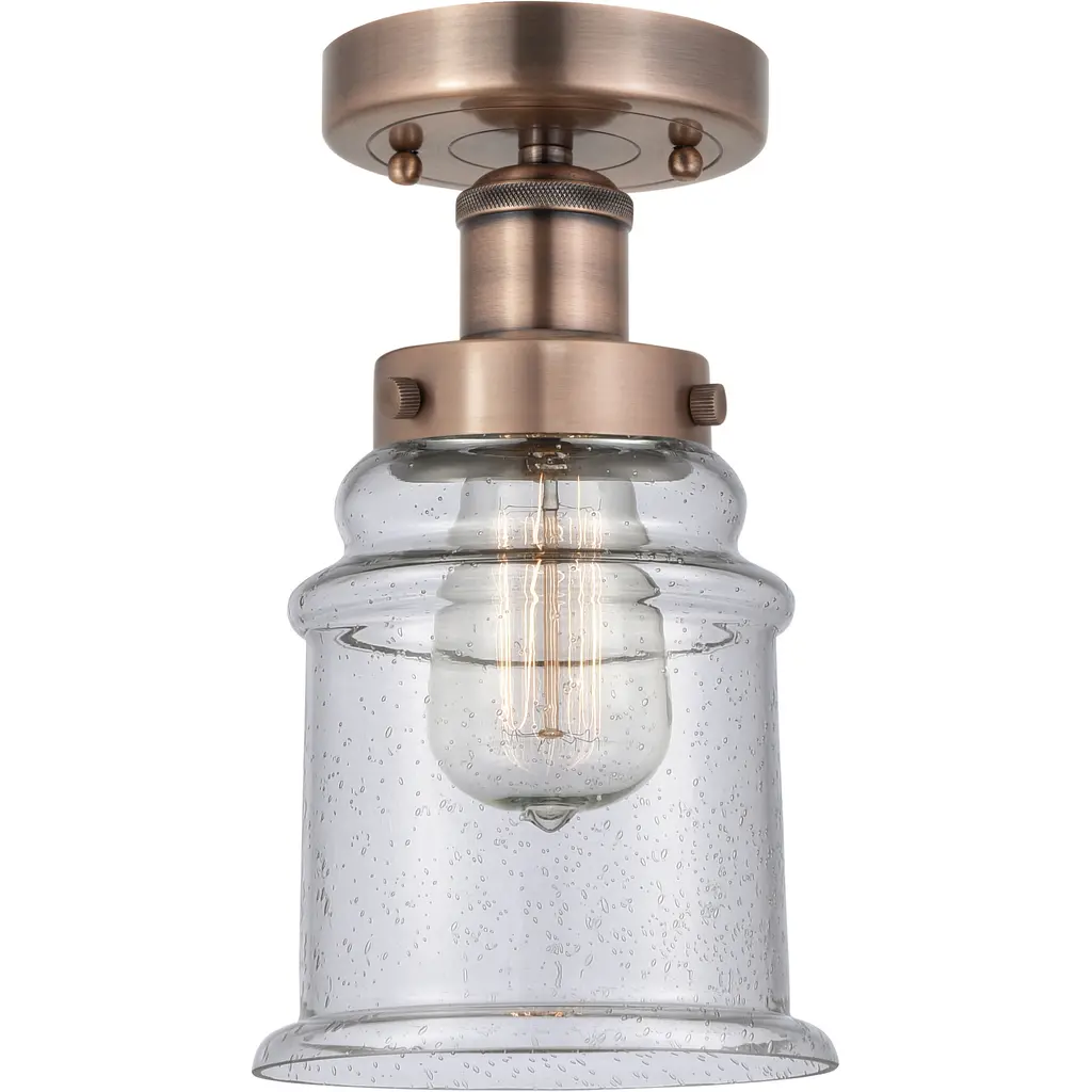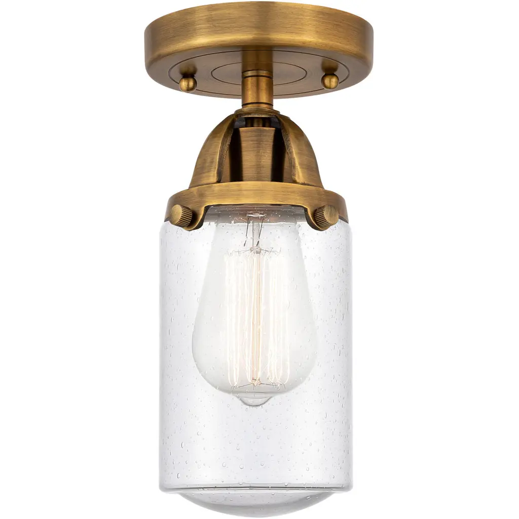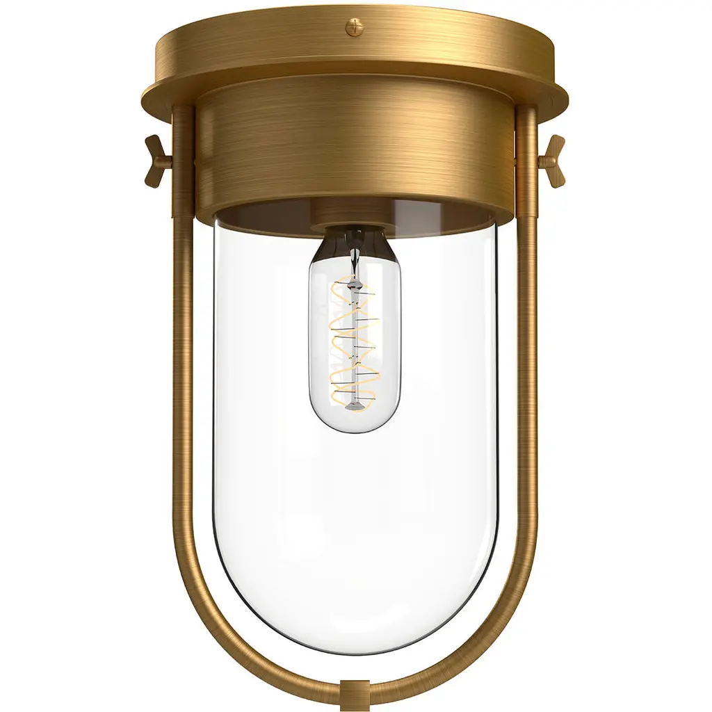 The Cyrus Flushmount from Alora Mood provides an elegant, open presence that expresses a stately transitional character through its surroundings. A stepped, smooth steel structure with a round canopy and socket housing for its single, downward-facing lamp, it extends a tall dome shade of smooth glass around it, gentling excess glare to a warm, pleasant glow below. The housing extends a slender, U-shaped accent around the shade, featuring a small wing nut accent on each side which add a stylish, retro element of contrast to the glass and extends a line of shadow from the fixture’s centerline.