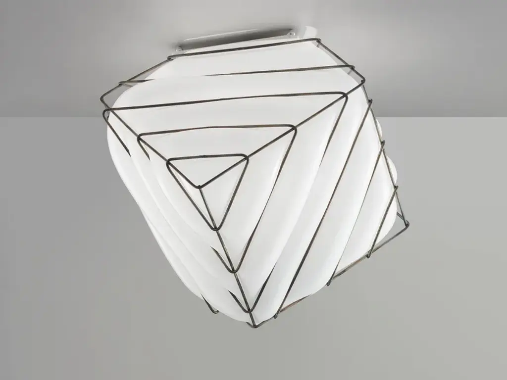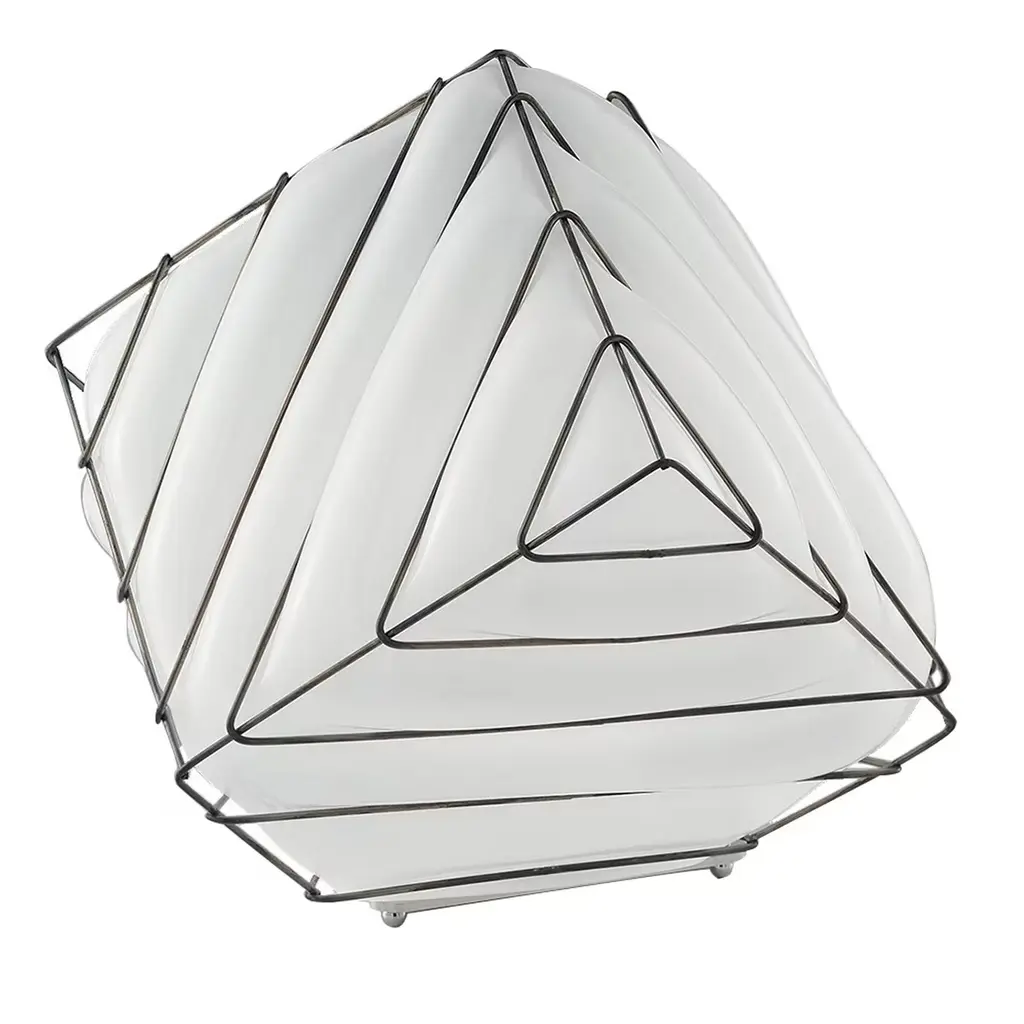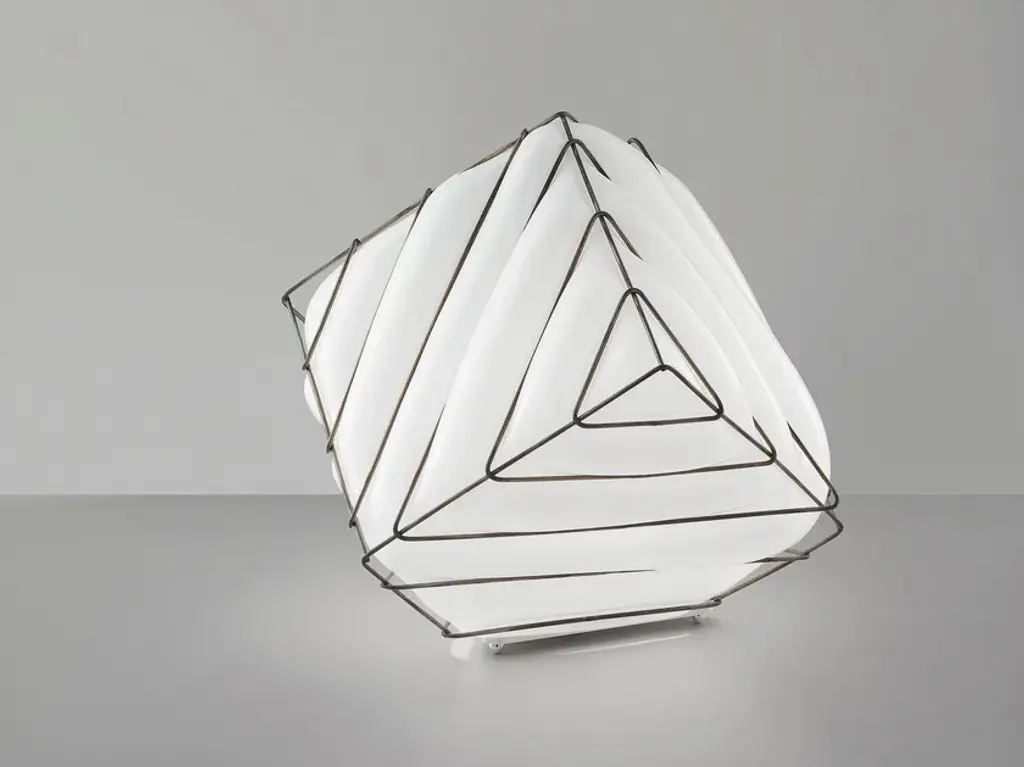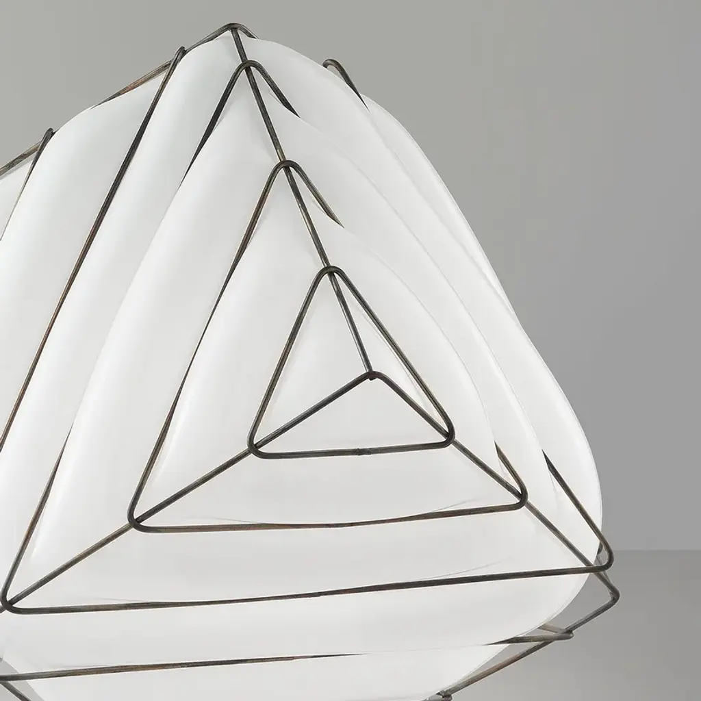 The lamp takes formal inspiration from the object used in many games. The geometric form is controlled in each of its faces by a series of metal lines that call upon the soft spilling of glass.