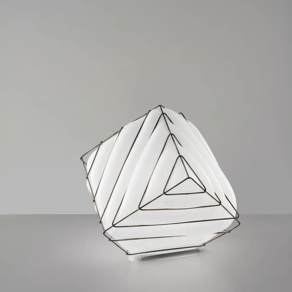 In the shape of a cube impossibly balancing on one of its corners, this table lamp is a celebration of artisanal craftsmanship and contemporary style. Its silhouette is created by a bronzed steel structure that encapsulates the Murano glass shade, mouth-blown directly into it and treated with a white finish on the inside to ensure the maximum diffusion of light. The lightbulb is E27 max 100W. Available also in UL E26 max 60W. Due to handcrafting, slight changes in metal's finish may occur.