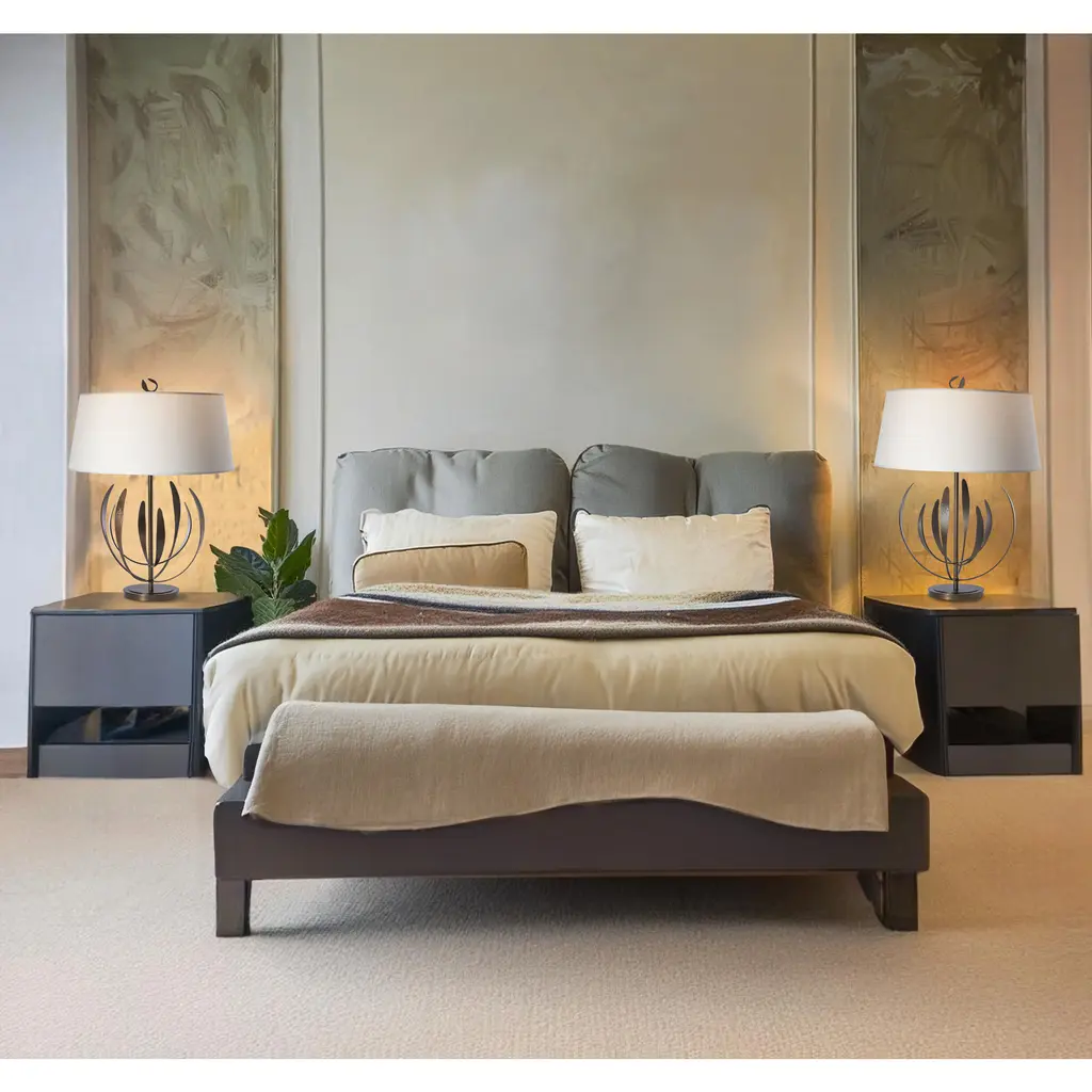 From our iconic Dahlia pendant comes this stunning table lamp designed by Paul Marr Hilliard. With two tiers of four upward reaching, delicate "petals" each, the Dahlia Table Lamp exudes grace and elegance. Petals are handcrafted by Vermont artisans in the 1800 degree red-hot fires of the forge. The finial detail is pure perfection, peeking out from above its beautiful fabric shade.