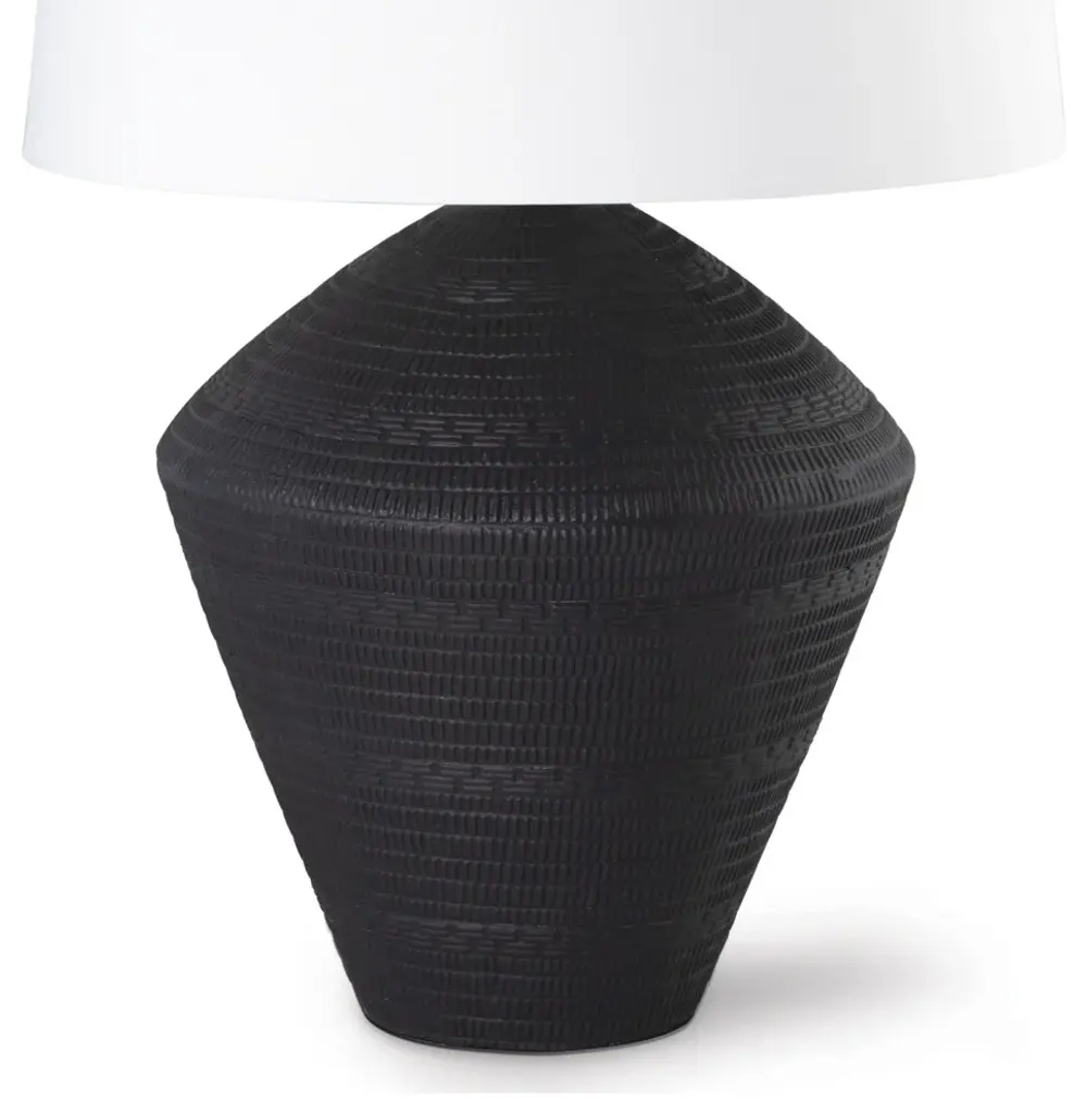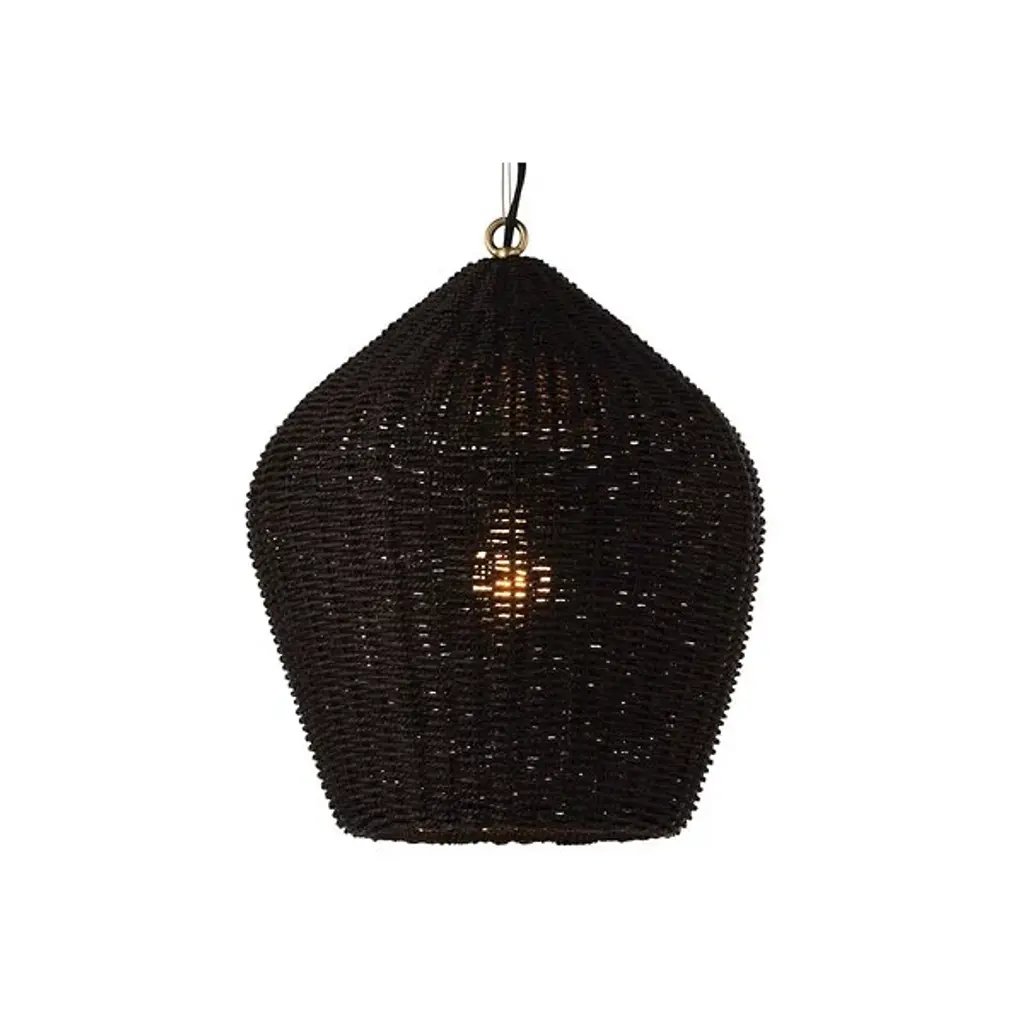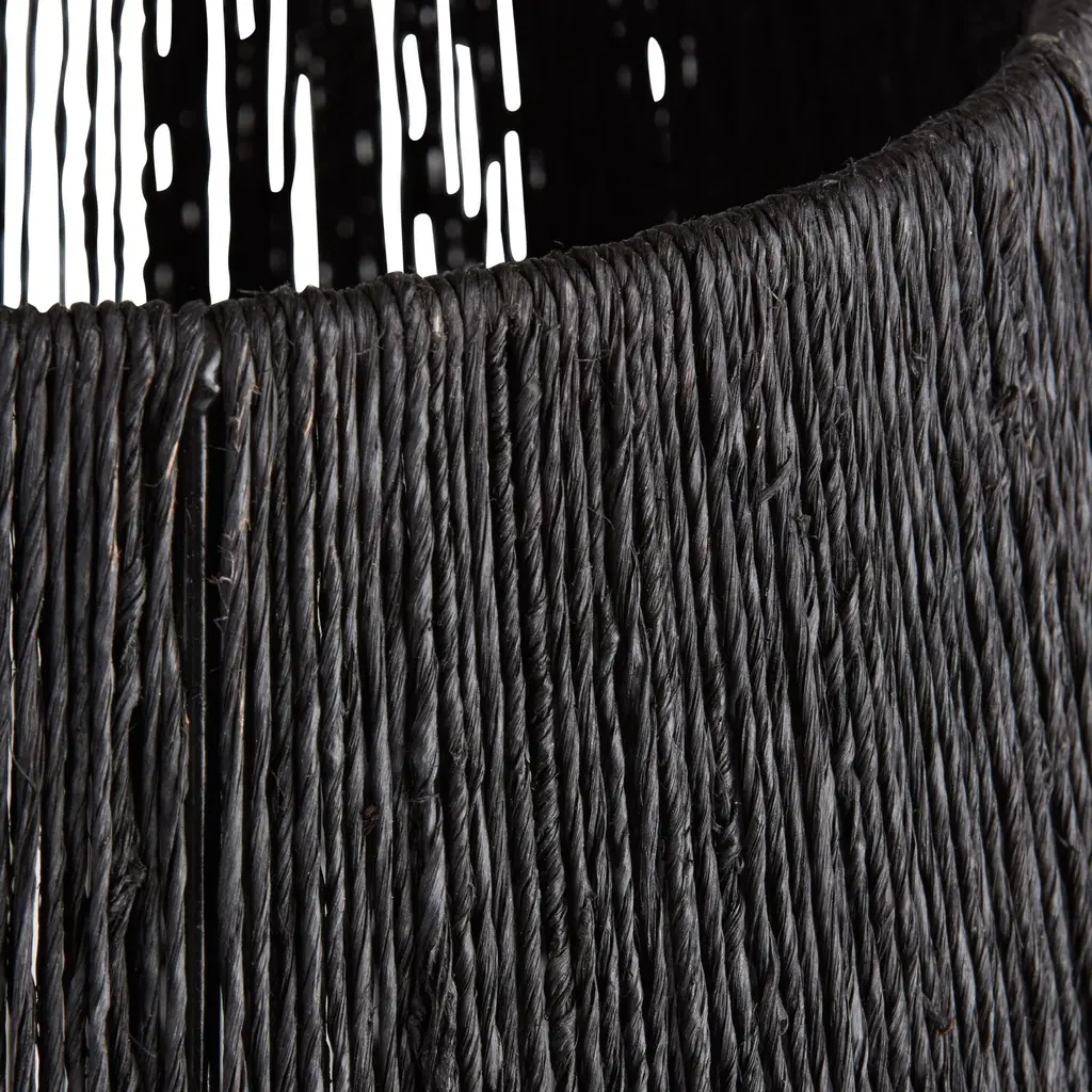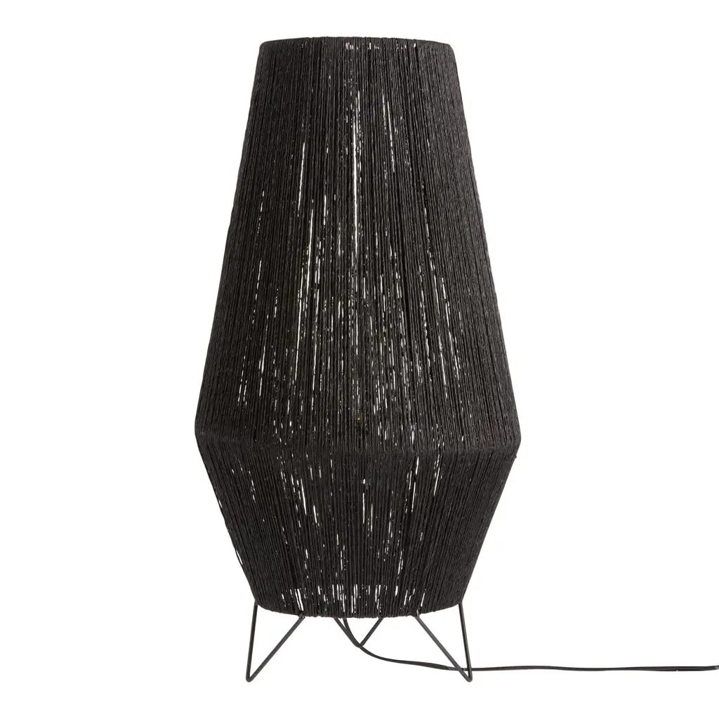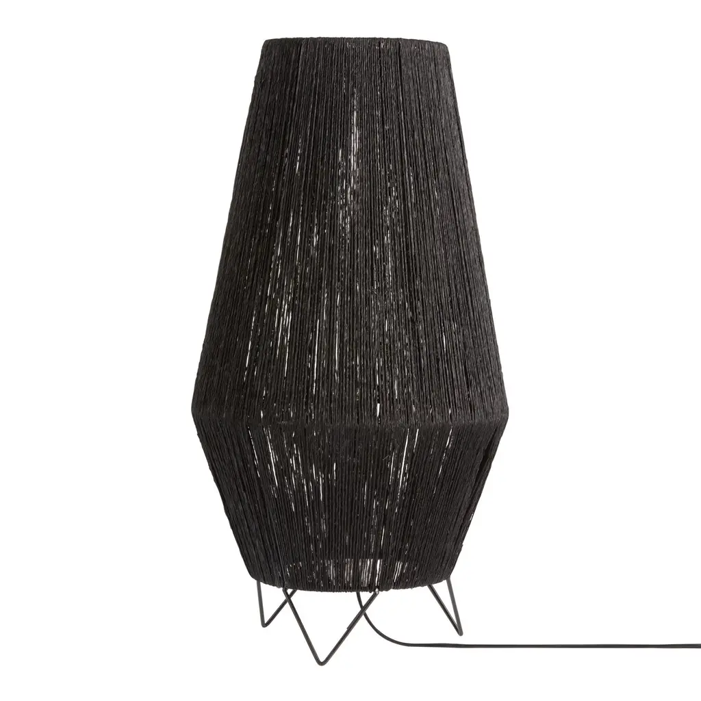 Handwoven by Vietnamese artisans of vertical strands of jute rope over a metal teardrop-shaped frame, our exclusive Dahlia table lamp is modern and dramatic in all black. Perched on a petite triangle-leg tripod, its open weave allows light to pour through and illuminate a desk or tabletop with soft, warm light. Perfect ambient mood lighting for any room, its textured dimension, dark hue and chic silhouette are romantic and timeless.