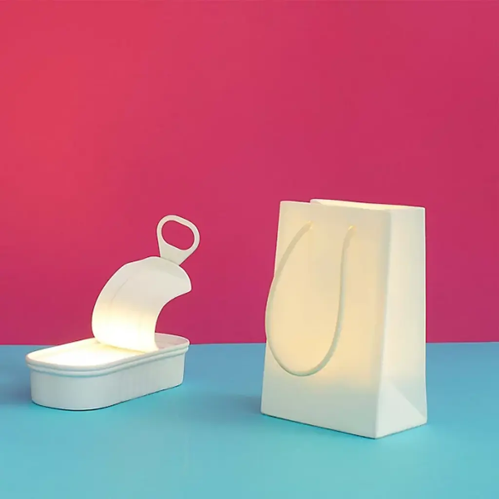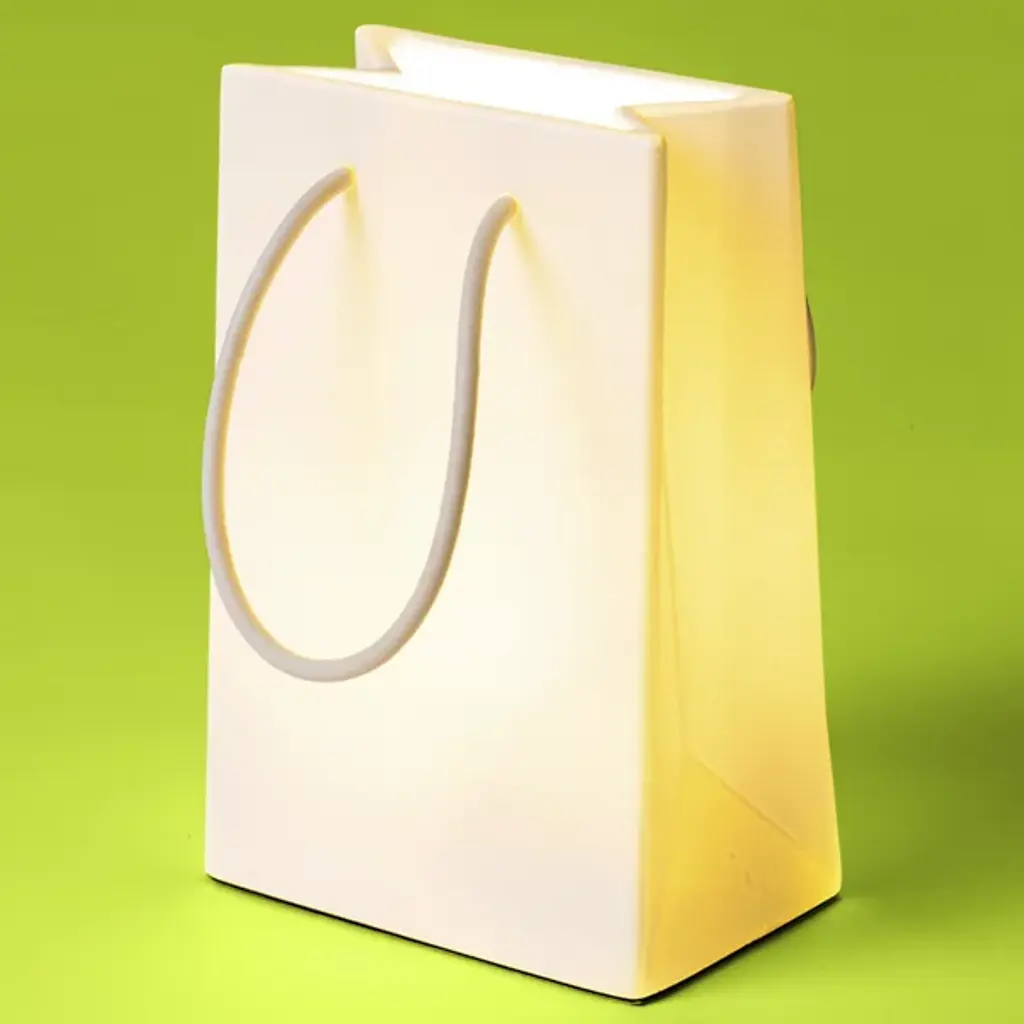 Shed some light on your daily routine or go glam with the captivating Daily Glow Shopper Cordless LED Table Lamp from Seletti. Designed by Alessandro Zambelli, this whimsical lamp takes the form of a creased shopping bag, slightly open to reveal an inner LED light source that glows through the bag's translucent walls, accented by looping handles. Crafted from resin, it offers up to 20 hours of bright illumination at maximum power and up to 120 hours at minimum power on a single USB charge, with a charging time of just 6 hours. Blending contemporary design with a hint of whimsy, this lamp brings both charm and functionality to any modern setting, providing a versatile and energy-efficient lighting solution.