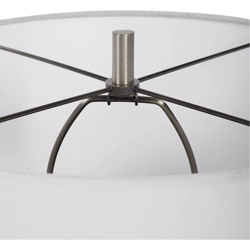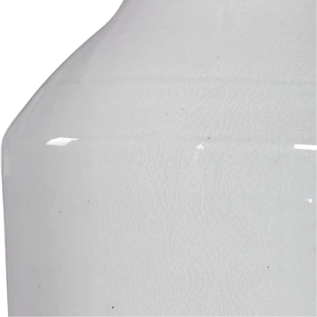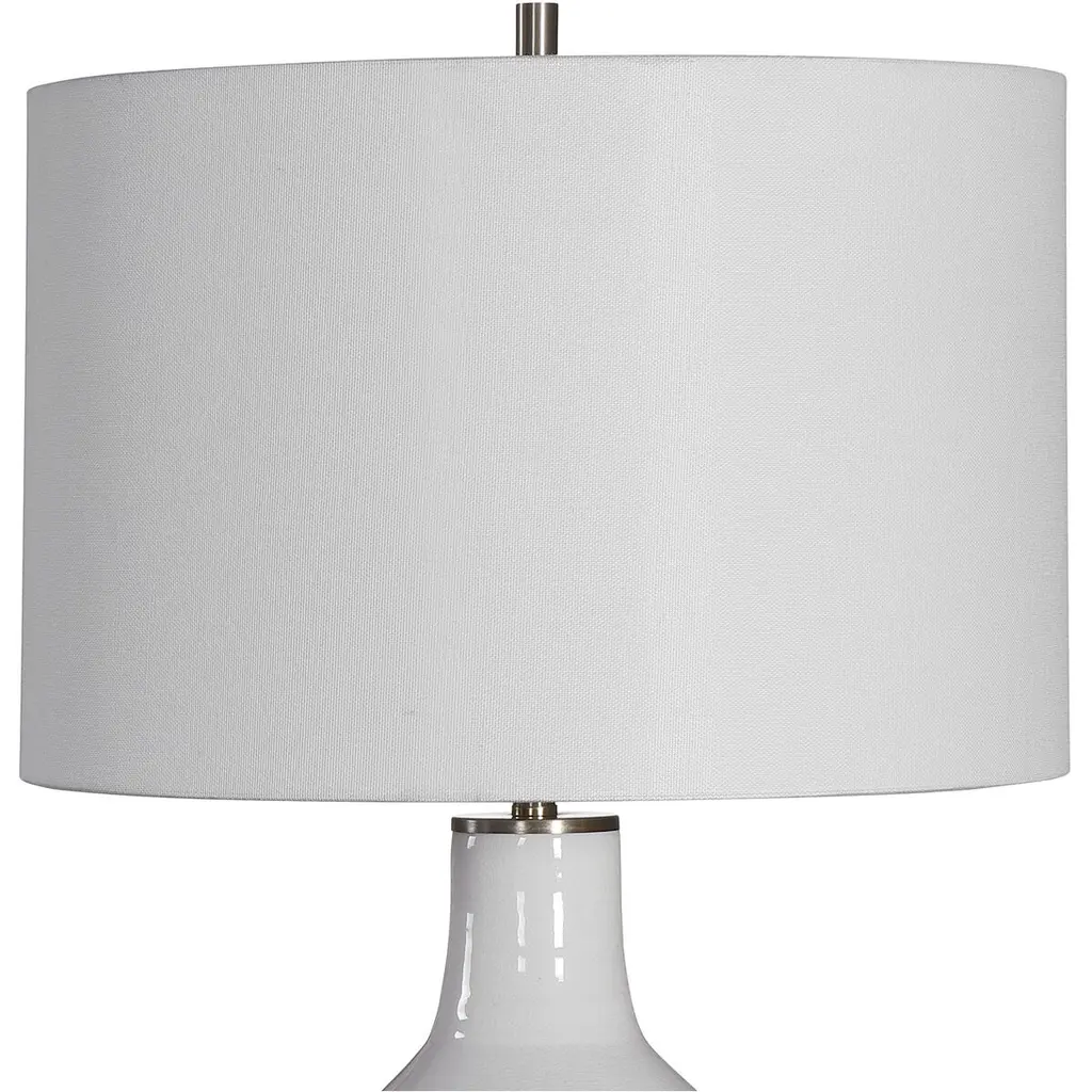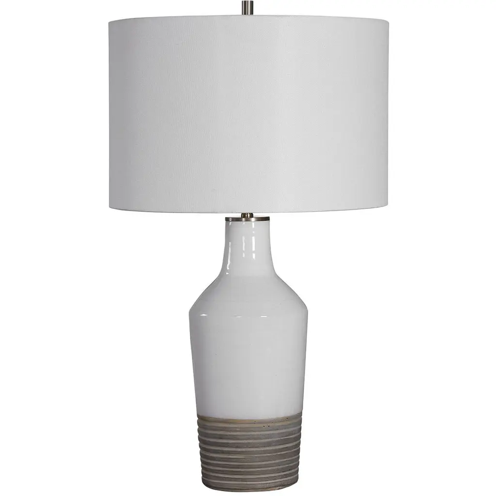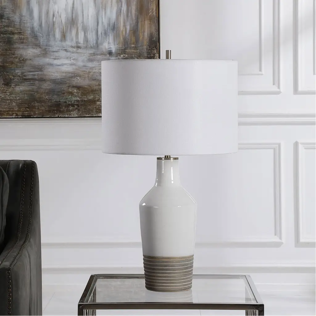 This Ceramic Lamp Features A White Crackle Glaze Finish Paired With A Ribbed Textured Bottom Half Finished In An Aged Terra Cotta Tone, Accented By Light Antique Brushed Brass Details. A Simple White Linen Fabric Drum Shade Compliments The Piece.