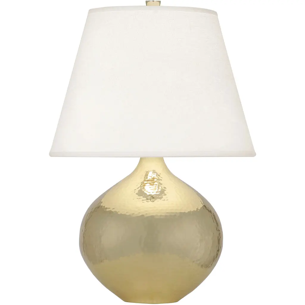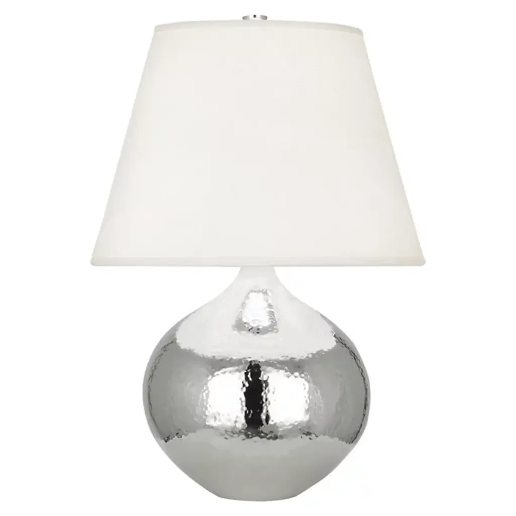 An interesting collaboration of radiance and raw. The Dal Table Lamp 9870 by Robert Abbey keeps the glow brimming in your living room. This table lamp is designed with a round sloping base that displays artistic traits with its hammered surface on top of a striking metallic finish. Robert Abbey's diverse notes of design are implemented through the lamp's shade, which has a plain, streamlined profile that adds an interesting dimension to the lamp's base. With warm, inviting illumination, this fixture is sure to bring a sense of calm into a variety of living areas.