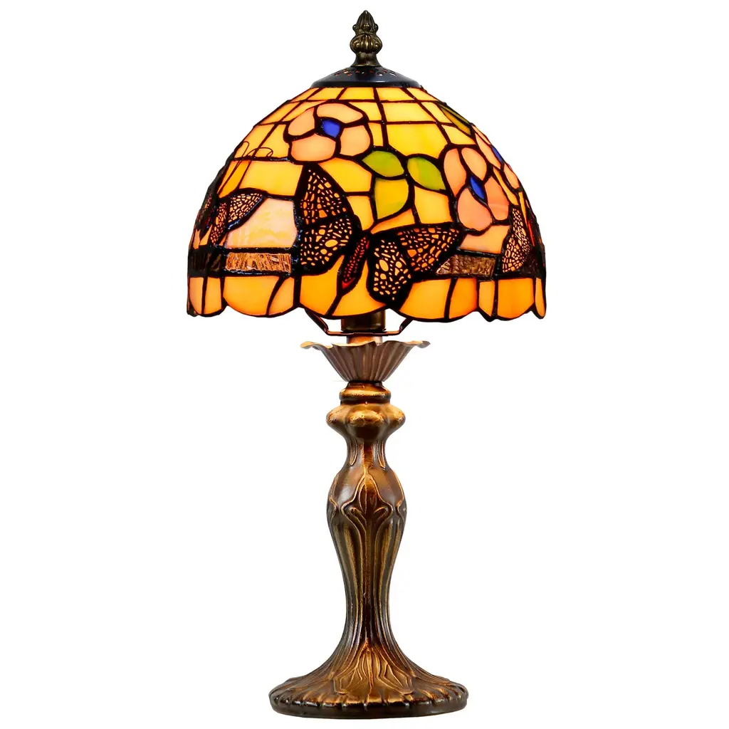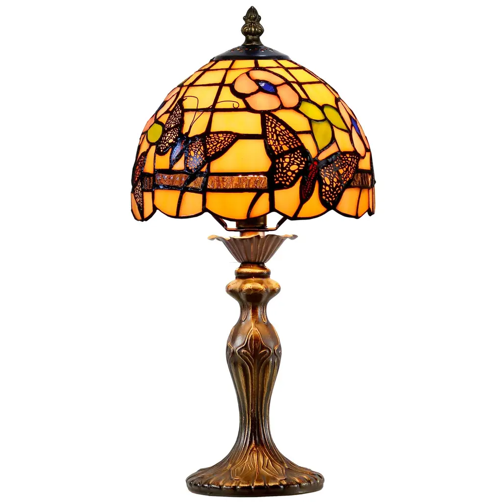 The Dale Tiffany TA24003 Ferndell Butterfly Tiffany Accent Lamp is a charming piece standing at 14.25 inches tall, featuring an antique bronze finish base that exudes classic elegance. The handcrafted art glass shade is adorned with vibrant butterfly and floral motifs, creating a captivating visual appeal. The detailed design and warm hues of the stained glass combine to produce a soft, inviting glow, making this accent lamp a delightful addition to any room. Its exquisite craftsmanship and artistic design not only provide functional lighting but also serve as a beautiful decorative element that enhances the ambiance of your living space.