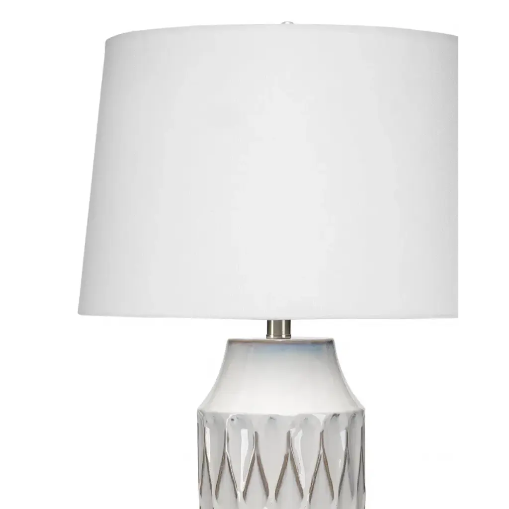 Add a touch of vintage flair to any room with this accent piece. Crafted of ceramic, this table lamp features a harlequin pattern and high/low glaze effect for an antiqued look. Paired with a linen shade that diffuses light for a soft glow.