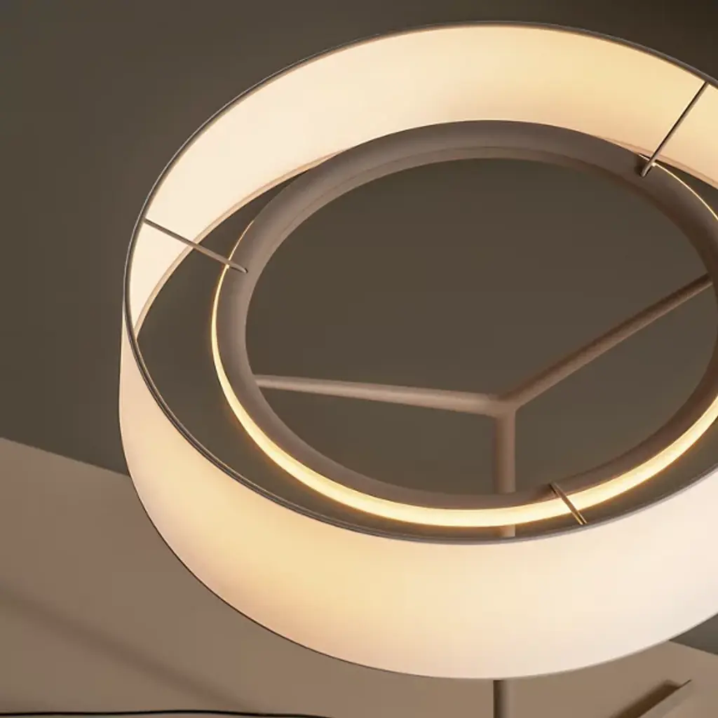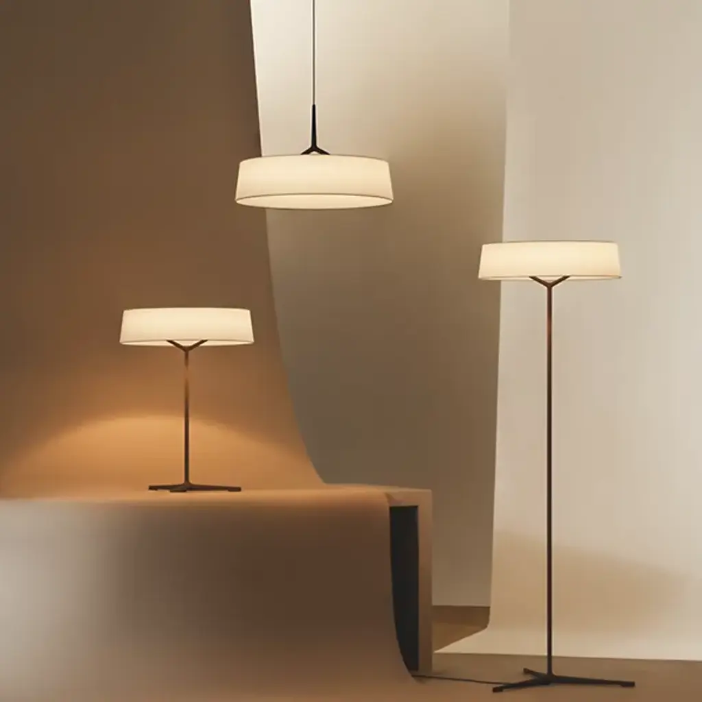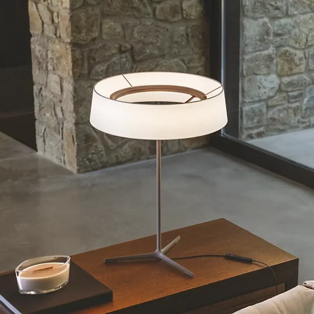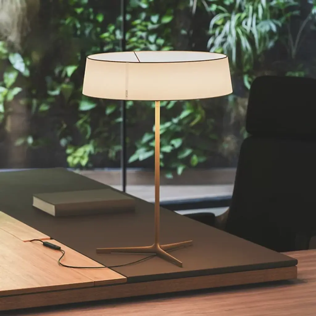 The Dama LED Table Lamp from Vibia pays tribute to classic lamp styles but updates them for modern sensibilities. It has a cylindrical shade that sits atop a slender aluminum stem with three branching legs. It's designed for intuitive use and installation, including smart capabilities and dimming control. It blends traditional charm with contemporary finesse and creates a warm, intimate ambiance with technical precision and elevated aesthetic appeal.