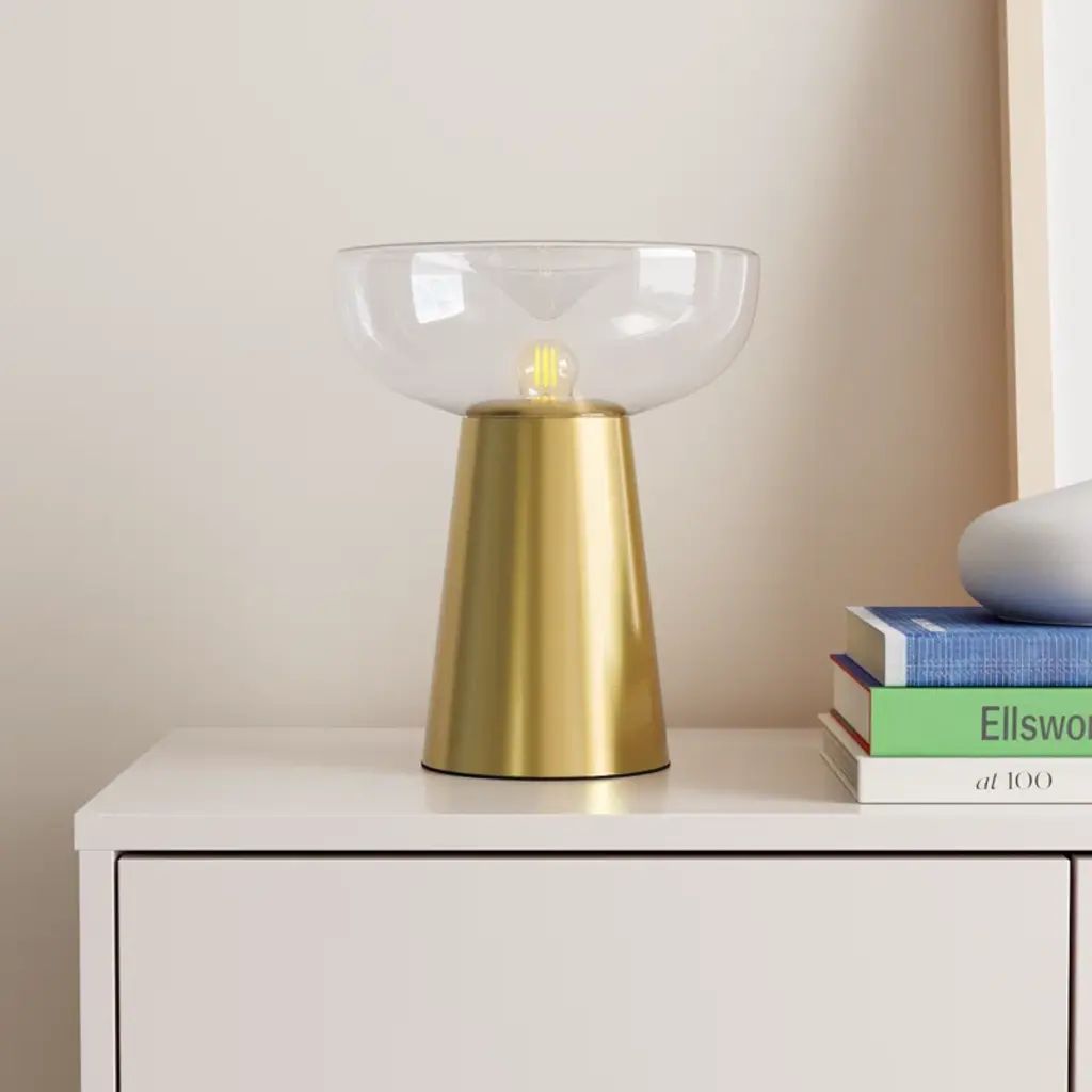 Make an eye-catching impact with our Damali table lamp. A strikingly refined profile and blend of fine materials bring distinct charm and elegance to the lamp. It balances a bowl shade upon a tapered metallic base to attain a sculptural presence. Accented with gleaming brass, our petite and statement-making lamp adds interest and polish to any tabletop. Its glass shade offers a warm glow to illuminate your nightstand, desk, console, or end table in style.